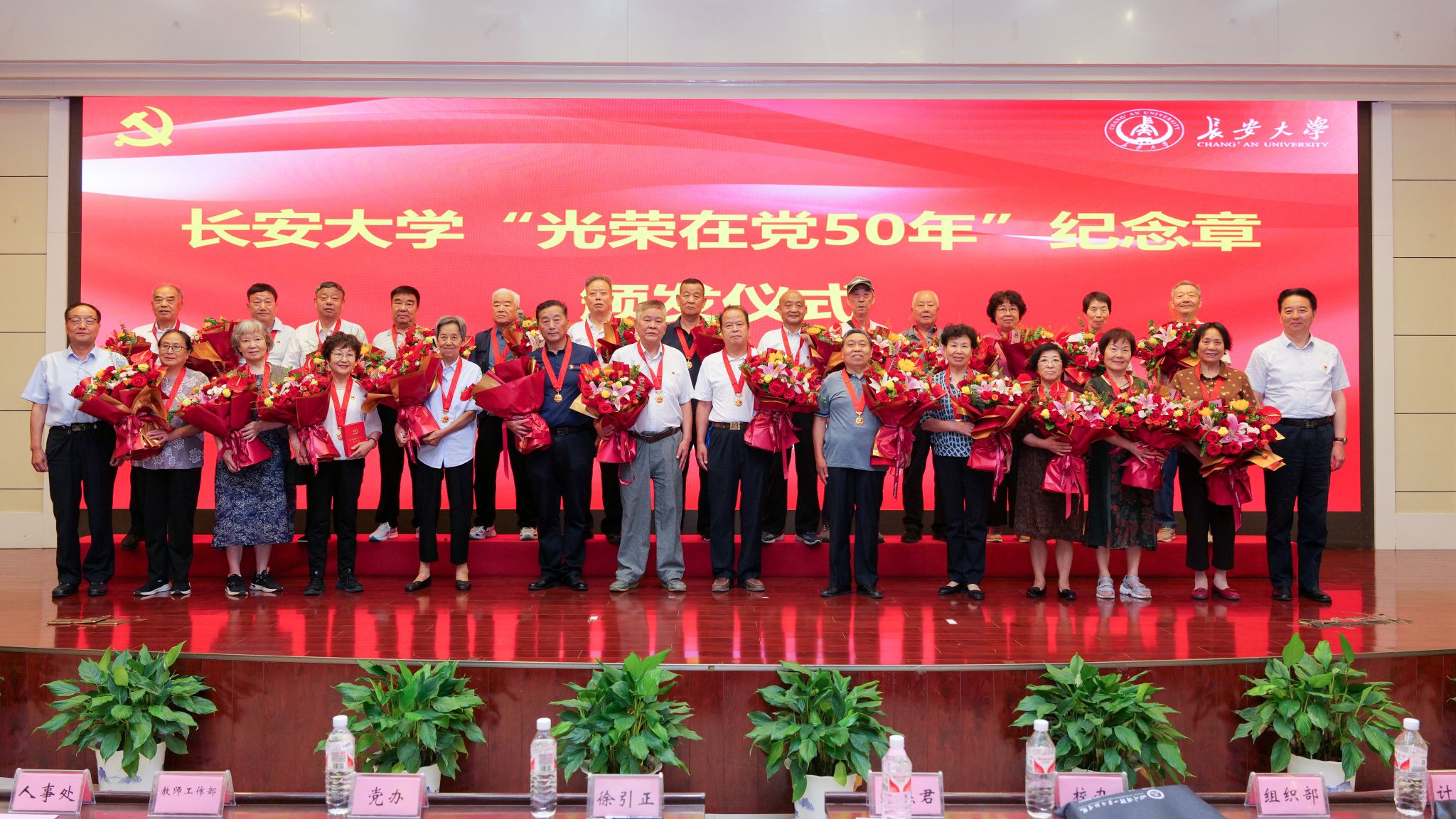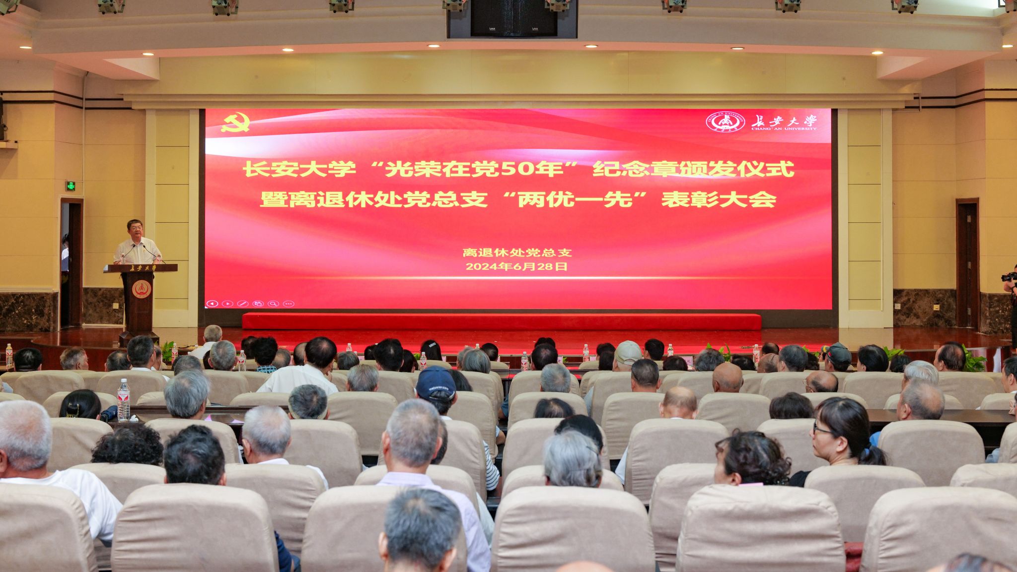 6月28日下午,長安大學“光榮在黨50年”紀念章頒發儀式暨離退休處黨總支“兩優一先”表彰大會在南校區學術交流中心報告廳舉行。校黨委副書記徐引正、副校長朱杰君出席會議,學校離退休工作領導小組成員單位負責人,“光榮在黨50年”老黨員代表、退休黨支部支委、“兩優一先”獲獎代表、離退休處機關黨支部全體黨員以及學生黨員代表共150余人參加大會。會議由離退休處黨總支書記戴宏主持。離退休處處長薛慶文宣讀表彰決定。