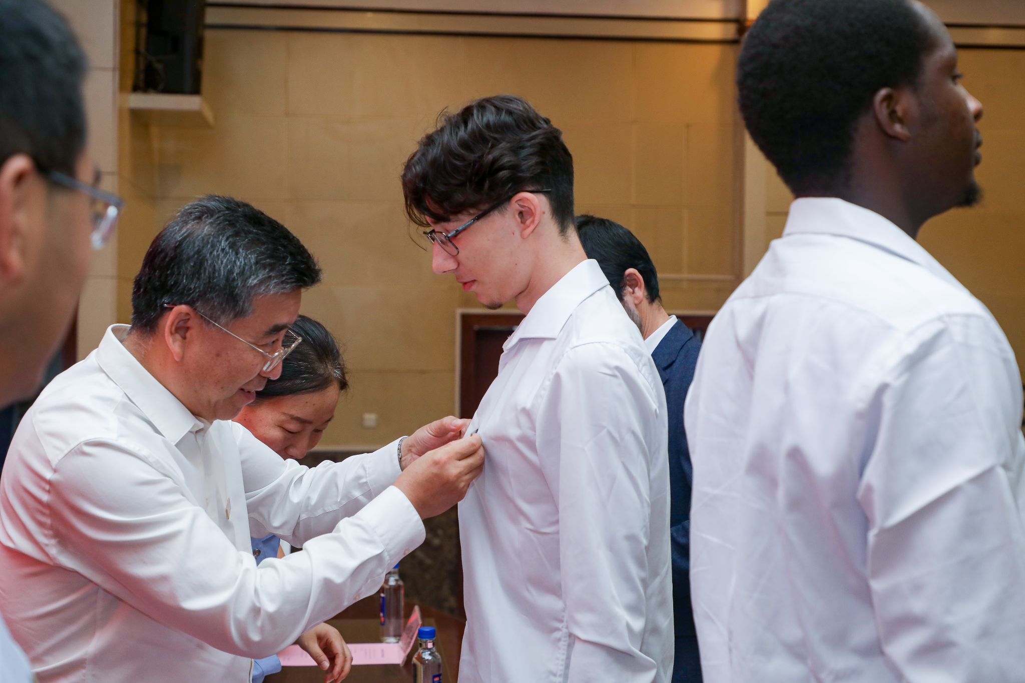 全體國際新生鄭重地佩戴上長安大學校徽,標志他們正式成為長大人,開啟逐夢之旅。