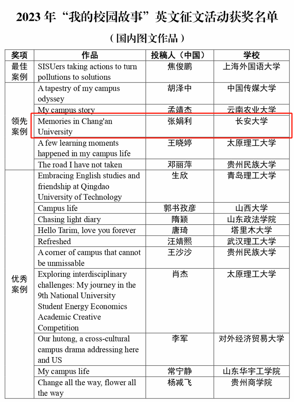 近日,由中國日報社主辦,21世紀報社、中國日報客戶端、中國對外政務信息服務平臺·留學中國聯合承辦的2023年“我的校園故事”英文征文活動獲獎名單揭曉,我校外國語學院教師張娟利的作品《Memories in Chang'an University》獲“領先案例”獎。