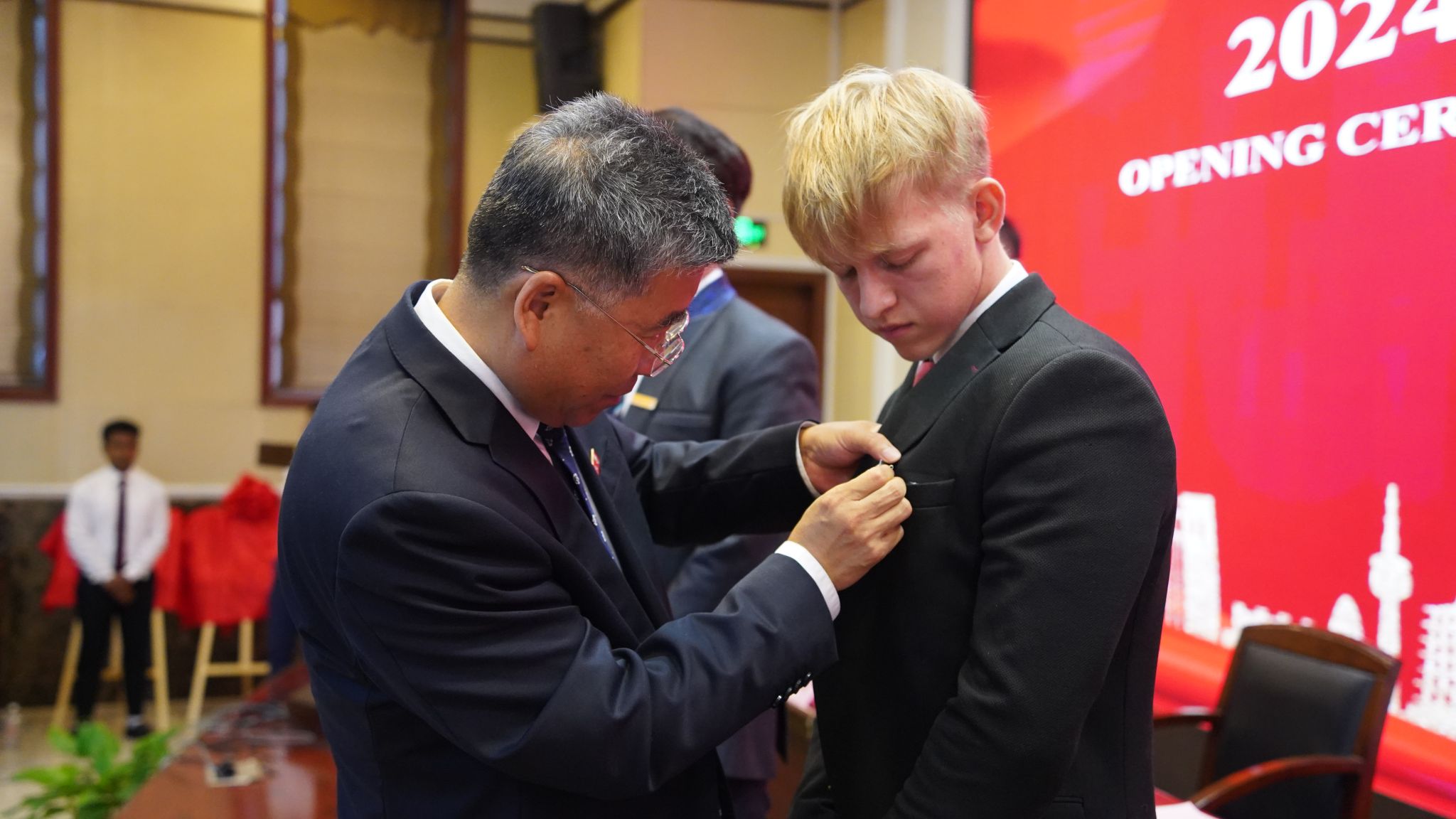 范文為國際新生代表頒授校徽,全體國際新生鄭重地為自己佩戴上長安大學(xué)校徽,標志他們正式成為長大人,開啟逐夢之旅。