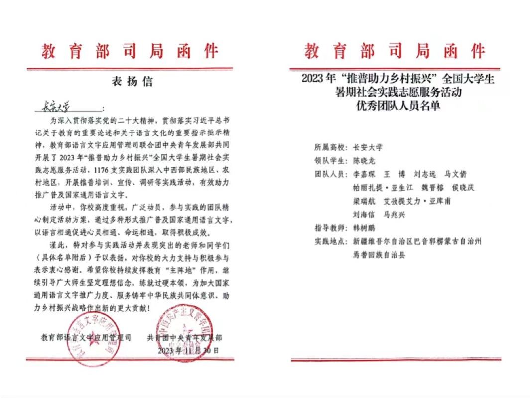 近日,教育部語(yǔ)言文字應(yīng)用管理司、共青團(tuán)中央青年發(fā)展部共同主辦的2023年“推普助力鄉(xiāng)村振興”全國(guó)大學(xué)生暑期社會(huì)實(shí)踐志愿服務(wù)活動(dòng)評(píng)優(yōu)結(jié)果揭曉,長(zhǎng)安大學(xué)赴新疆巴音郭楞“踐悟黨的二十大·攜手共繪同心圓”暑期社會(huì)實(shí)踐隊(duì)榮獲“優(yōu)秀團(tuán)隊(duì)”稱(chēng)號(hào),同時(shí)收到教育部語(yǔ)言文字應(yīng)用司和共青團(tuán)中央青年發(fā)展部的表?yè)P(yáng)信件。