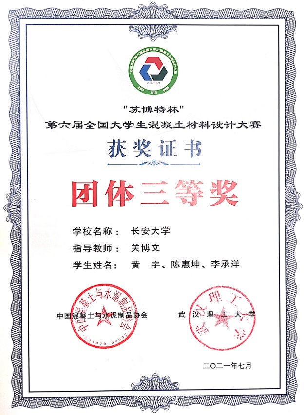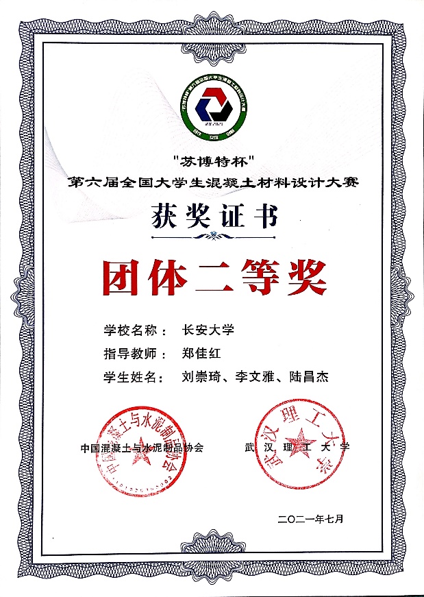 7月13-15日,在武漢理工大學(xué)舉行“蘇博特杯”第六屆全國大學(xué)生混凝土材料設(shè)計(jì)大賽。我校兩支隊(duì)伍分獲團(tuán)體二等獎(jiǎng)和團(tuán)體三等獎(jiǎng)。