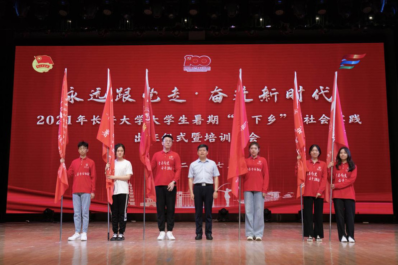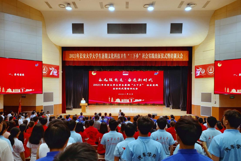 7月6日晚,學校2021年大學生暑期文化科技衛生“三下鄉”社會實踐出征儀式暨培訓大會在北校區長安文化藝術中心大禮堂舉行。校黨委副書記黎開誼出席大會,宣傳部、學工部、研工部、教務處、保衛處、校醫院等部門主要負責人,各院系主管學生工作的黨政領導、校團委全體干部、各分團委書記、社會實踐立項團隊指導教師及隊員代表參加了大會。校團委書記張永主持儀式。