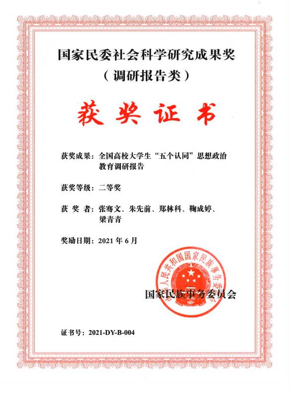 近日,國家民委辦公廳印發(fā)《關于公布2020年度全國民族工作優(yōu)秀調(diào)研報告獲獎名單的通知》(民辦發(fā)〔2021〕39號),由我校推薦申報的《全國高校大學生“五個認同”思想政治教育調(diào)研報告》,獲得國家民委社會科學研究成果獎(調(diào)研報告類)二等獎。