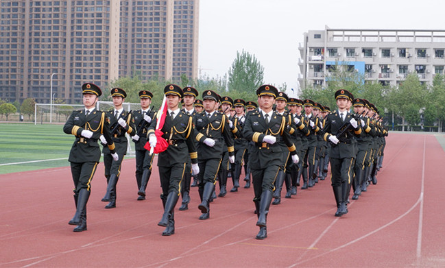 迎著朝陽的光輝,國旗護衛隊護衛著鮮艷的五星紅旗入場。他們步伐鏗鏘、口號嘹亮,整齊劃一地護旗出列。全體師生莊嚴肅穆,面向國旗行注目禮,伴隨著《義勇軍進行曲》的響起,五星紅旗冉冉升起,在場的每個人高唱國歌,深切地表達了對祖國母親的熱愛。