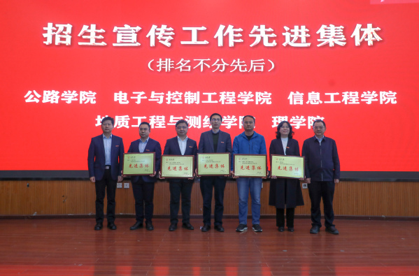 大會對先進集體和先進個人進行了表彰。公路學院、電子與控制工程學院、信息工程學院、地質工程與測繪學院、理學院等5個學院獲得“招生宣傳先進集體”榮譽稱號;馬克思主義學院姜建芳等44人獲得“招生宣傳先進個人”榮譽稱號。招生專員張艷杰、范高功、韓文生、喬愛榮、陳建平等5位老師獲得“優秀學子回母校”寒假社會實踐活動“優秀指導教師”榮譽稱號,25支隊伍獲得“優秀實踐團隊”榮譽稱號,經濟與管理學院羅英鷂等同學獲得“先進個人”和“優秀宣傳員”榮譽稱號。