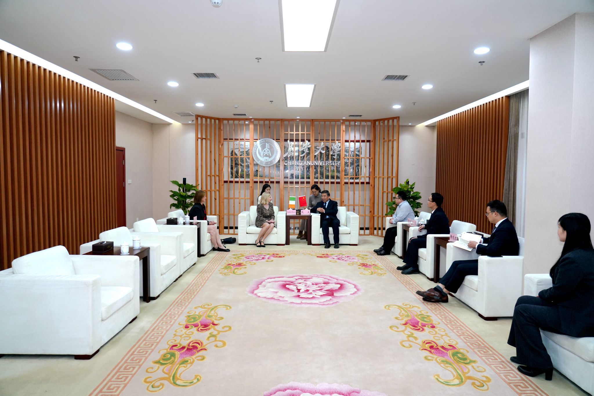 3月25日,愛爾蘭都柏林大學(xué)副校長Aoife Ahern、長安都柏林國際交通學(xué)院副教務(wù)長Catherine MacKenzie一行2人應(yīng)邀來我校訪問交流,副校長范文在北校區(qū)北辰樓貴賓廳會見來訪客人,長安都柏林國際交通學(xué)院、國際合作與交流處主要負(fù)責(zé)人陪同會見。