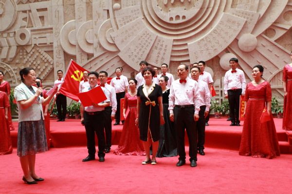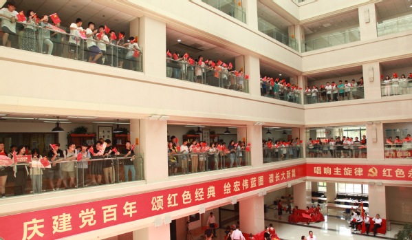 《沒有共產黨就沒有新中國》的師生同唱將活動推向高潮,旋律慷慨激昂,歌聲催人奮進。師生用嘹亮的歌聲抒發對黨的忠誠,用飽滿的激情表達對黨的熱愛。隨后,圖書館領導干部、各黨支部委員、黨員代表、民主黨派代表等,在紅色經典書展區、特藏庫、社會科學庫等特色區域進行了紅色經典段落誦讀。