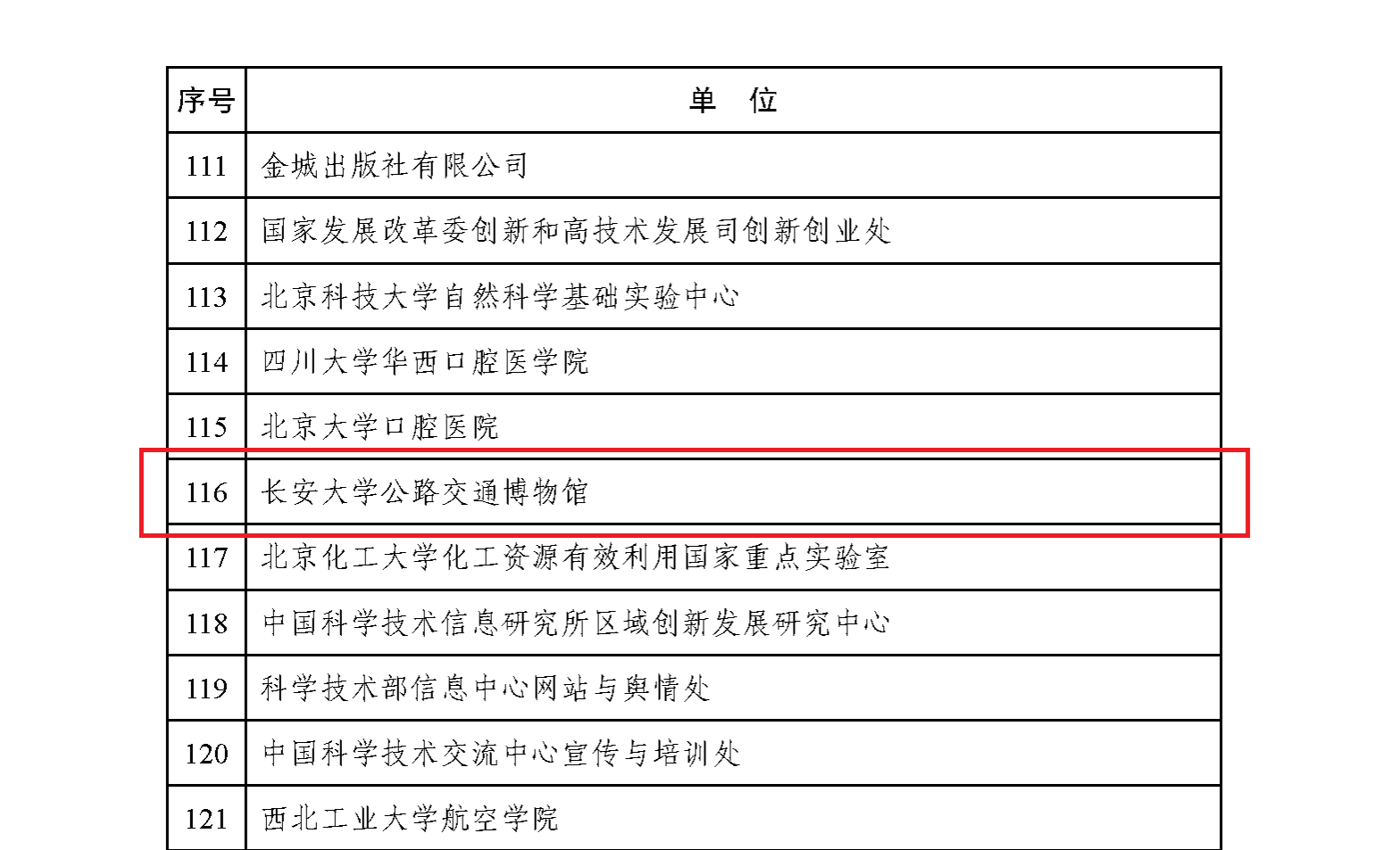 8月22日,科技部、中央宣傳部、中國科協發布《關于表彰全國科普工作先進集體和先進工作者的決定》,長安大學公路交通博物館榮獲“全國科普工作先進集體”榮譽稱號。