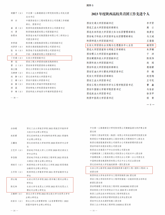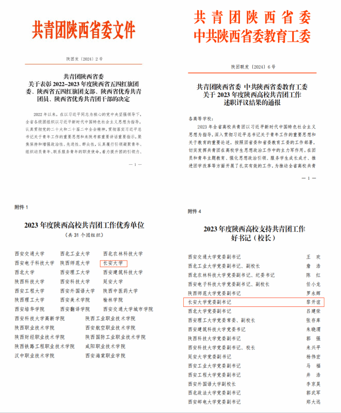 近日,共青團陜西省委、中共陜西省委教育工委印發《關于2023年度陜西高校共青團工作述職評議結果的通報》,共青團陜西省委印發《關于表彰2022-2023年度陜西省五四紅旗團委、陜西省五四紅旗團支部、陜西省優秀共青團員、陜西省優秀共青團干部的決定》,校團委榮獲“2023年度陜西高校共青團工作優秀單位”稱號,校黨委副書記黎開誼榮獲“2023年度陜西高校支持共青團工作好書記”稱號,校團委副書記丁芝娟榮獲“2022-2023年度陜西省優秀共青團干部”稱號,校團委社會實踐與志愿服務中心主任謝雨陽榮獲“2023年度陜西高校共青團工作先進個人”稱號,汽車學院2021級車輛工程專業碩士研究生邢云翔、馬克思主義學院2022級馬克思主義理論專業碩士研究生陳見煒榮獲“2022-2023年度陜西省優秀共青團員”稱號,公路學院2020級道路橋梁與渡河工程(國際工程班)4班團支部榮獲“2022-2023年度陜西省五四紅旗團支部”稱號。