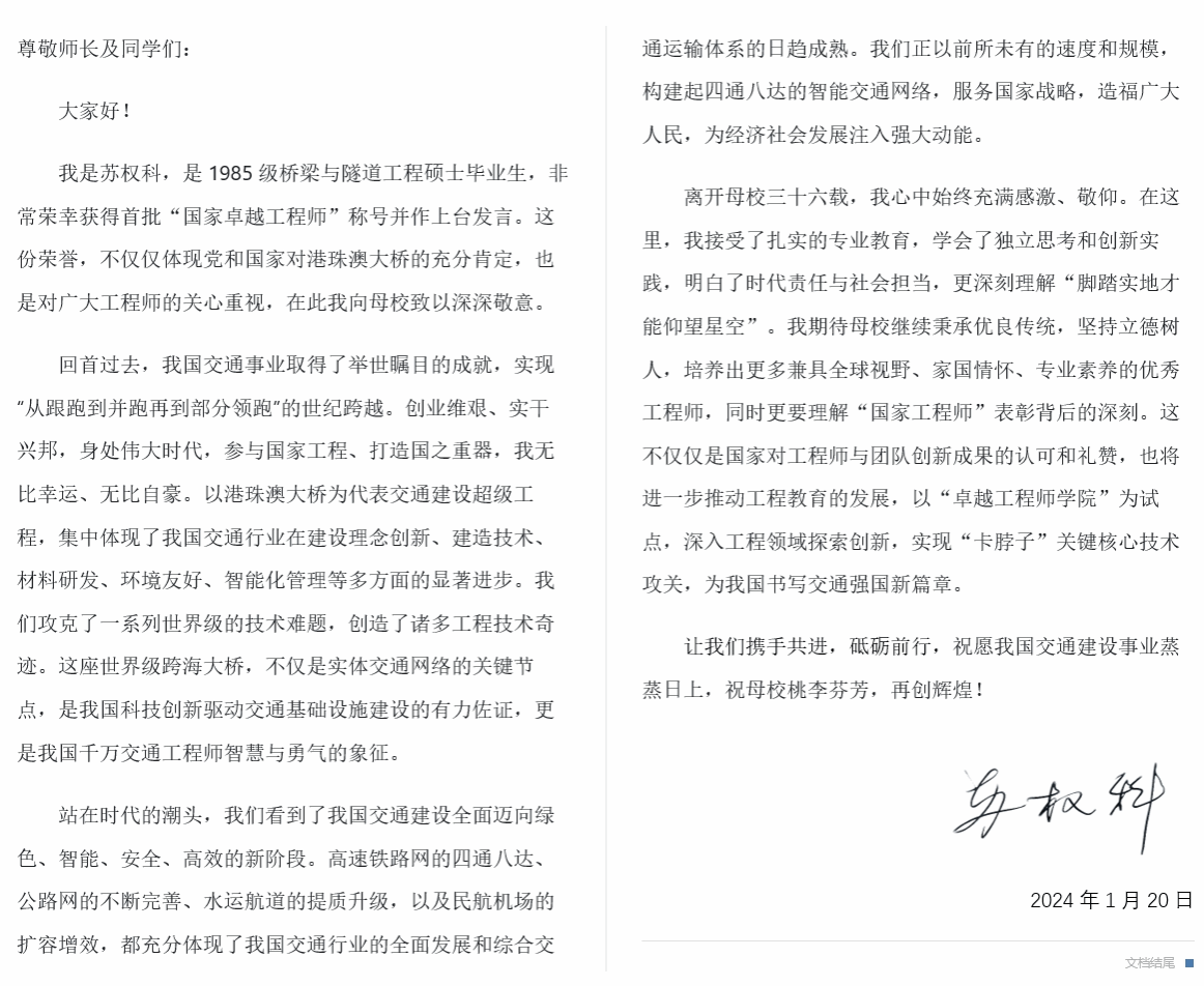 會前宣讀我校1988屆畢業生、港珠澳大橋總工、首批國家卓越工程師獲獎人蘇權科,2005屆畢業生、三一集團執行總裁兼總工程師、首批國家卓越工程師獲獎人易小剛寄語。蘇權科表示,“身處偉大時代,參與國家工程、打造國之重器,我無比幸運、無比自豪”“ 表彰不僅僅是國家對工程師與團隊創新成果的認可和禮贊,也將進一步推動工程教育發展,為我國書寫交通強國新篇章”;易小剛對母校寄語“工程師是推動工程科技發展的創新主體,是國家戰略人才力量的重要組成部分”“祝愿我國工程機械行業再創輝煌,祝福母校桃李滿天下,為中國制造強國做出更大貢獻”。