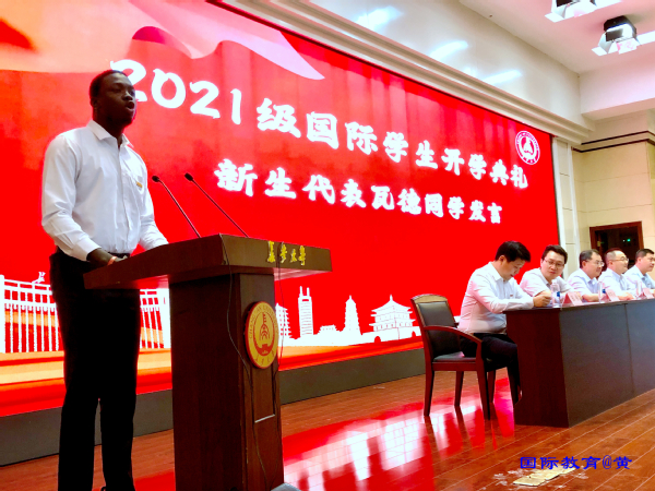 公路學院2021級研究生、塞內加爾籍瓦德代表全體新生向學校莊嚴承諾:努力學習、不斷進取,遵守中國法律法規、尊重中國文化、做各國友好交流的使者。