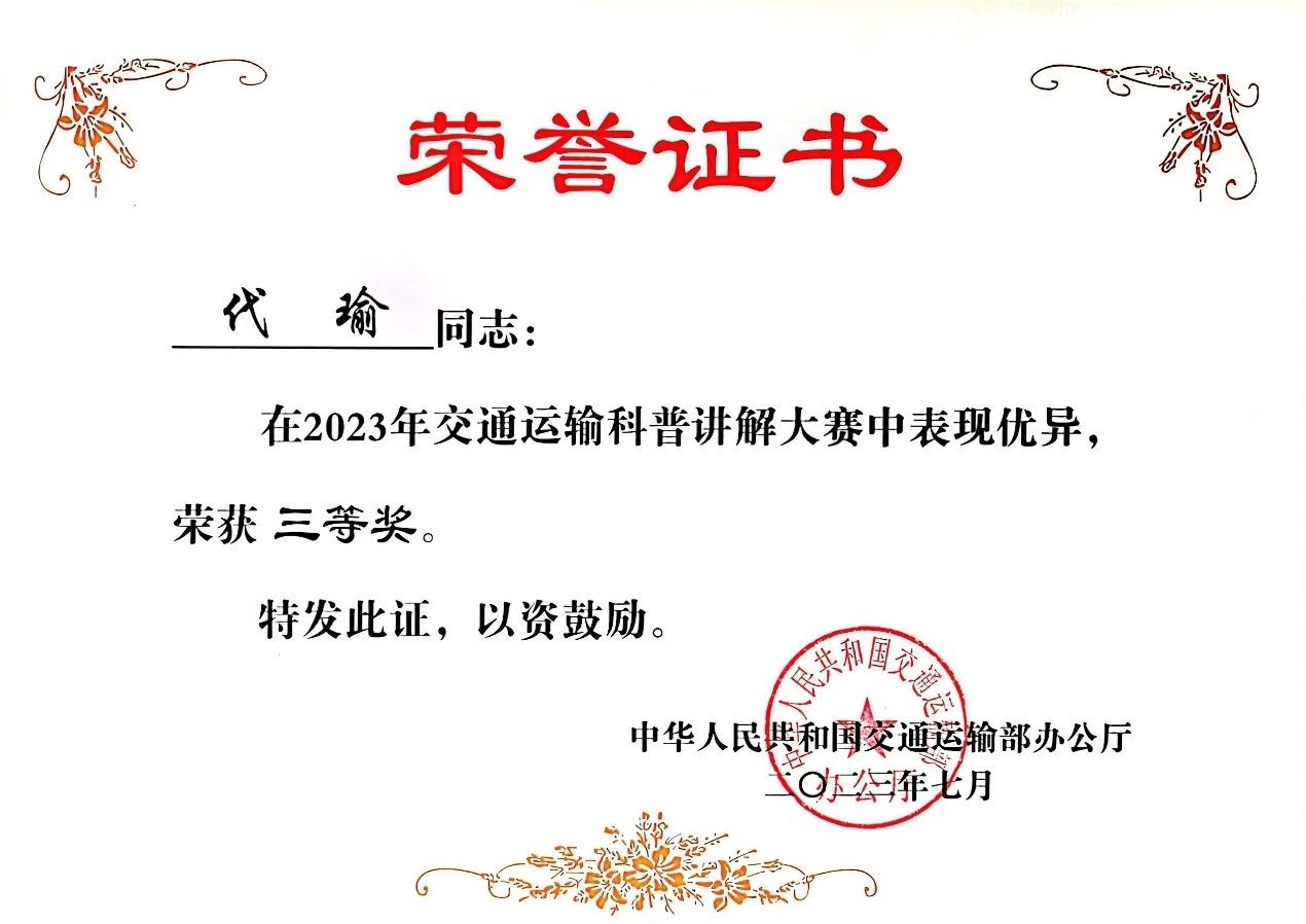 5月22日,2023交通運輸科普講解大賽決賽在青島舉辦,我校公路交通博物館胡啟航同學獲二等獎、代瑜同學獲三等獎,交通館獲優秀組織獎。6月30日,陜西省科技廳舉辦2023年陜西省科普講解大賽,交通館選送的代瑜和胡啟航兩位同學分別榮獲二等獎、三等獎各一項。