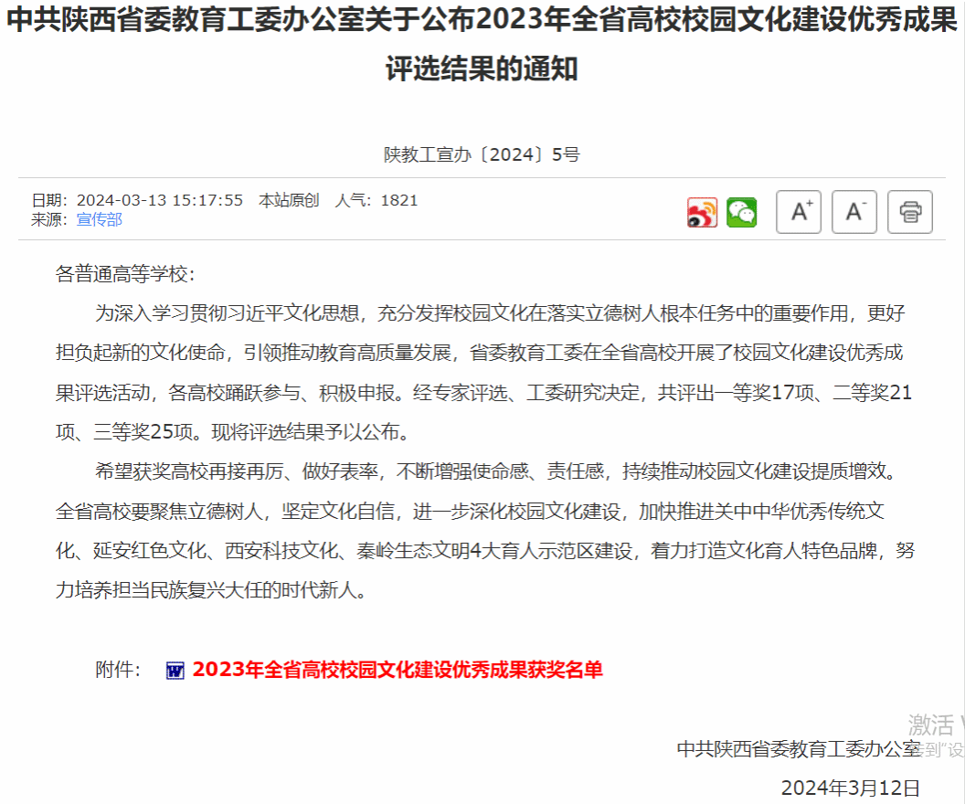 近日,中共陜西省委教育工委公布了2023年全省高校校園文化建設(shè)優(yōu)秀成果獲獎名單,由我校黨委宣傳部牽頭組織、檔案館具體申報的《激活紅色校史資源 賦能時代新人培育》榮獲一等獎。