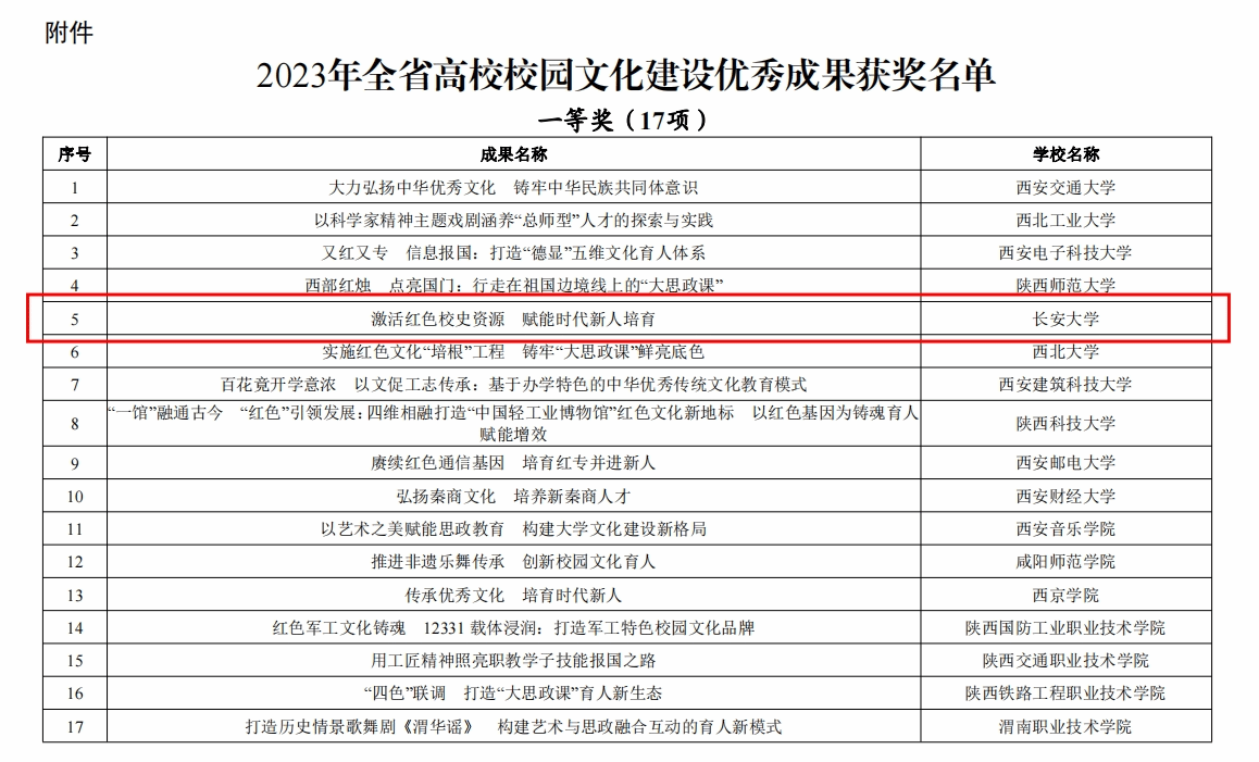 陜西高校校園文化建設(shè)優(yōu)秀成果評選活動由省委教育工委負責組織實施,此次評比在各高校評選推薦基礎(chǔ)上,經(jīng)專家評選、會議研究,共評出一等獎17項,二等獎21項,三等獎25項。下一步學校將統(tǒng)籌推進校園文化建設(shè),積極開展紅色文化精神研究,充分發(fā)揮紅色文化在塑造時代新人中的引領(lǐng)作用。