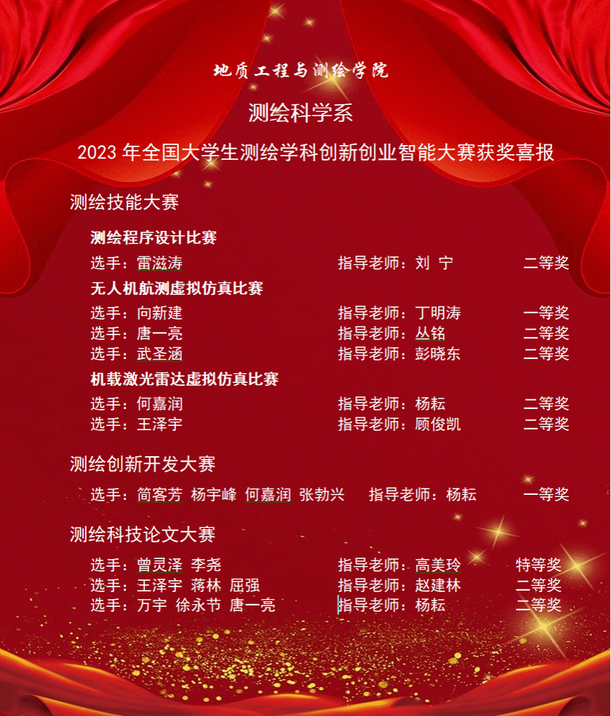 8月1日,教育部高等學(xué)校測繪專業(yè)教學(xué)指導(dǎo)委員會和中國測繪學(xué)會教育委員會公布“2023全國大學(xué)生測繪學(xué)科創(chuàng)新創(chuàng)業(yè)智能大賽”獲獎名單,我校測繪專業(yè)本科生獲得特等獎1項、一等獎2項、二等獎7項。