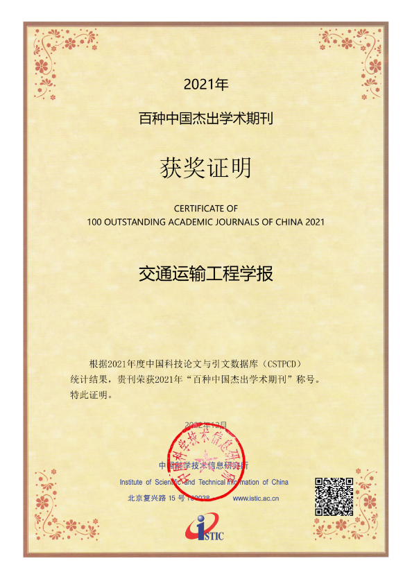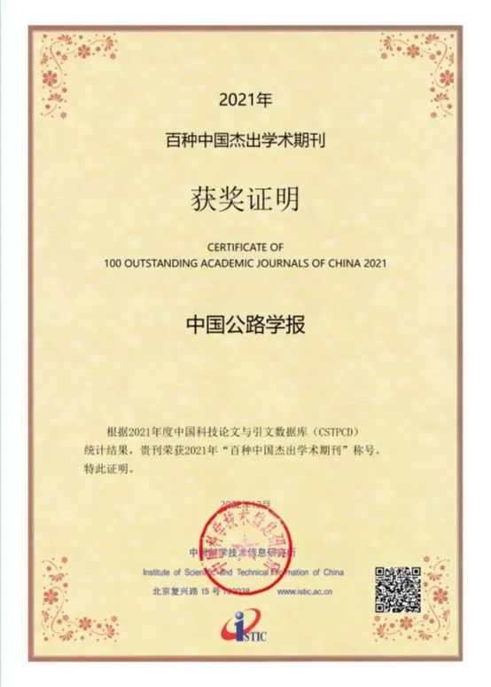 12月29日,中國科學技術信息研究所通過網絡直播方式舉行“中國科技論文統計結果發布會”,公布了“2021年百種中國杰出學術期刊”評選結果。《中國公路學報》《交通運輸工程學報》入選“2021年百種中國杰出學術期刊”,分別是第17、14次獲此殊榮。