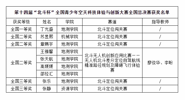 11月15日,“北斗杯”大賽組委會秘書處發布第十四屆“北斗杯”全國青少年空天科技體驗與創新大賽獲獎名單,我校在北斗定位闖關賽道獲得全國一等獎1項(第一賽道本科組全國唯一)、全國二等獎2項、全國三等獎2項;在北斗無人機創新應用比賽——無人機北斗差分定位自駕航線精準路徑規劃及障礙飛行體驗賽道取得全國二等獎1項。