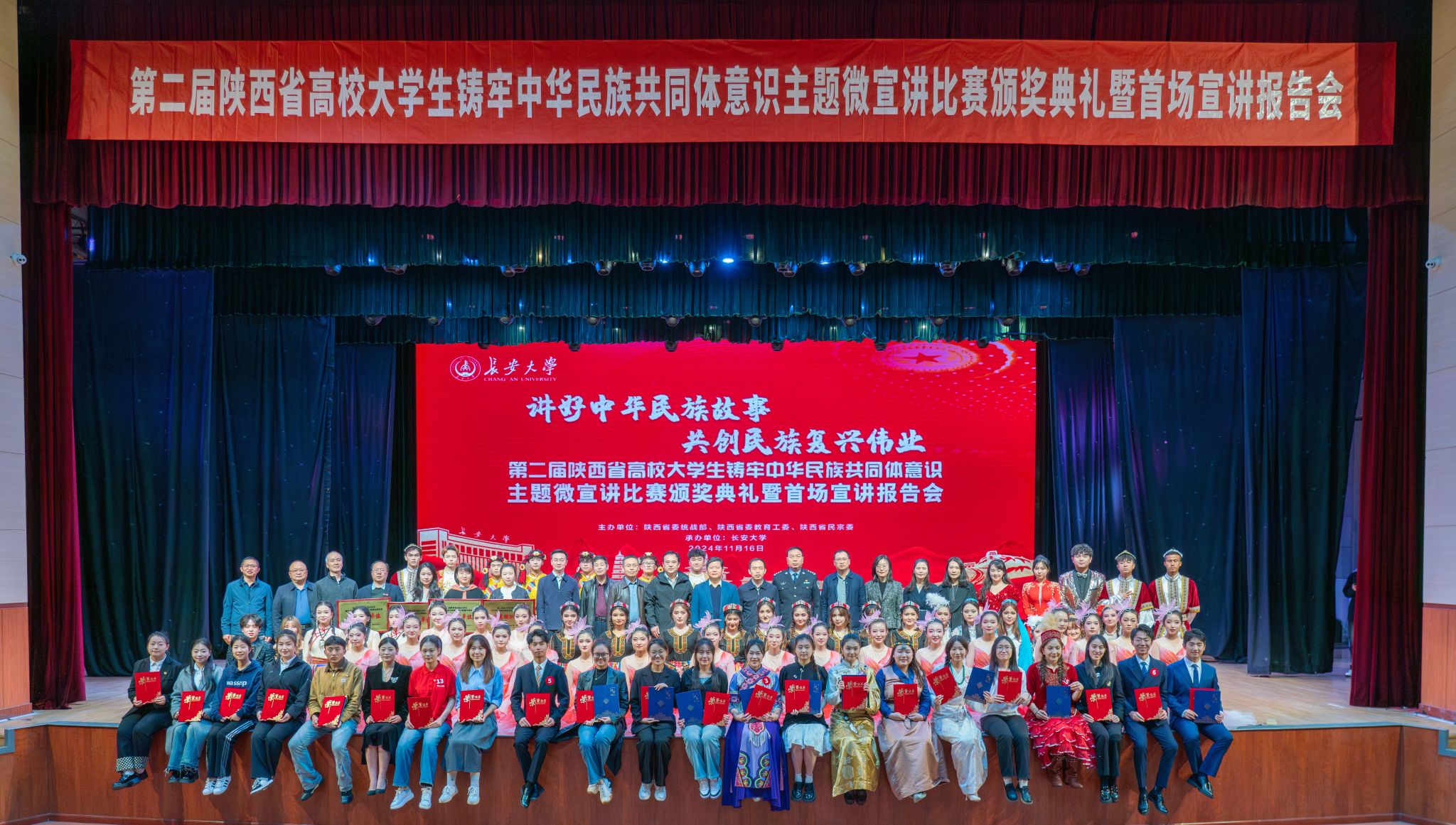 11月16日下午,“講好中華民族故事,共創民族復興偉業”第二屆陜西省高校大學生鑄牢中華民族共同體意識主題微宣講比賽頒獎典禮暨首場宣講報告會在北校區長安文化藝術中心舉行。省民宗委副主任王曉斐、校黨委副書記黎開誼、省民宗委民族一處處長張巖松、省委統戰部民族宗教處副處長張鑫、省委教育工委統戰部副部長白瑩、省民宗委民族一處一級調研員孟旭紅出席大會。