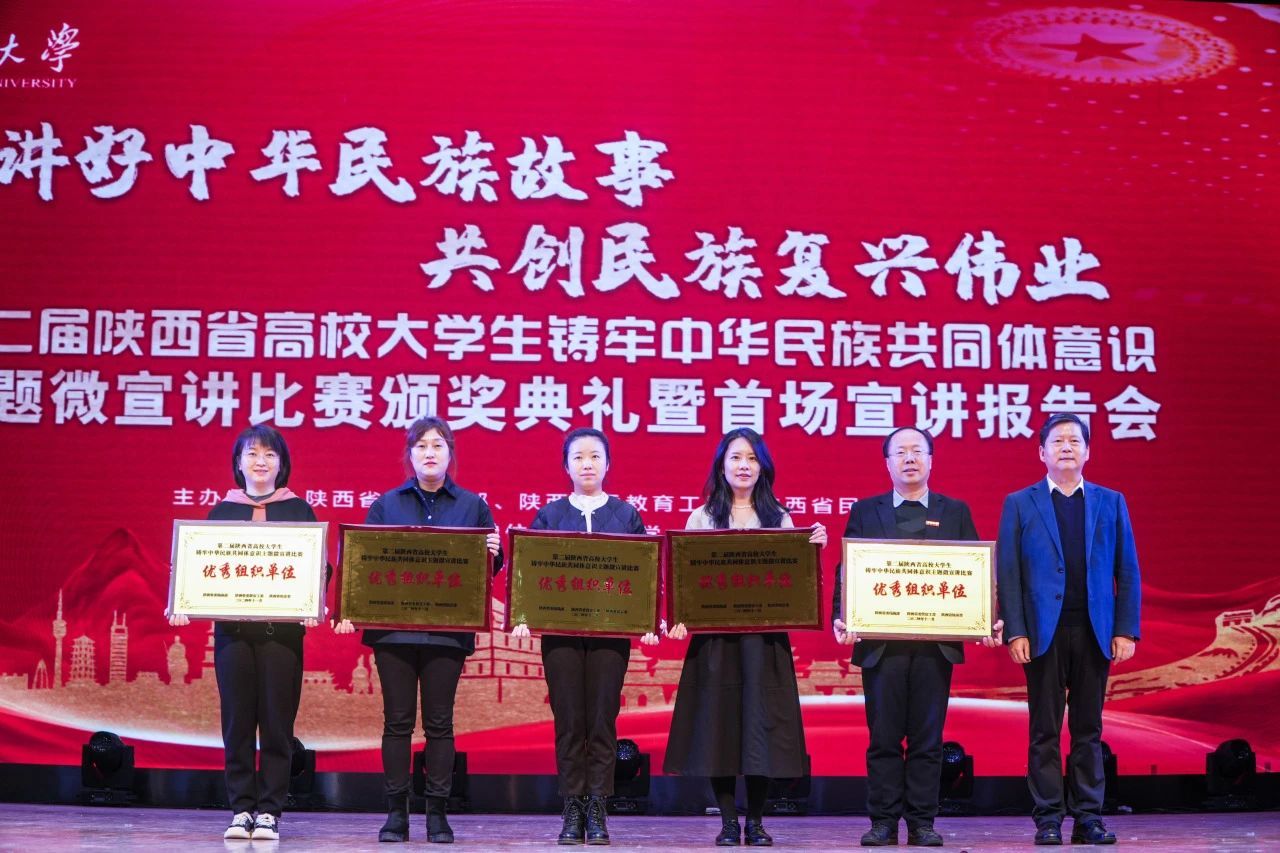 張巖松宣讀了《關于第二屆陜西省高校大學生鑄牢中華民族共同體意識主題微宣講比賽結果的通報》,5人榮獲一等獎、10人榮獲二等獎、15人榮獲三等獎,5所高校榮獲優秀組織獎。王曉斐、黎開誼等與會領導為獲獎選手及組織單位頒獎。