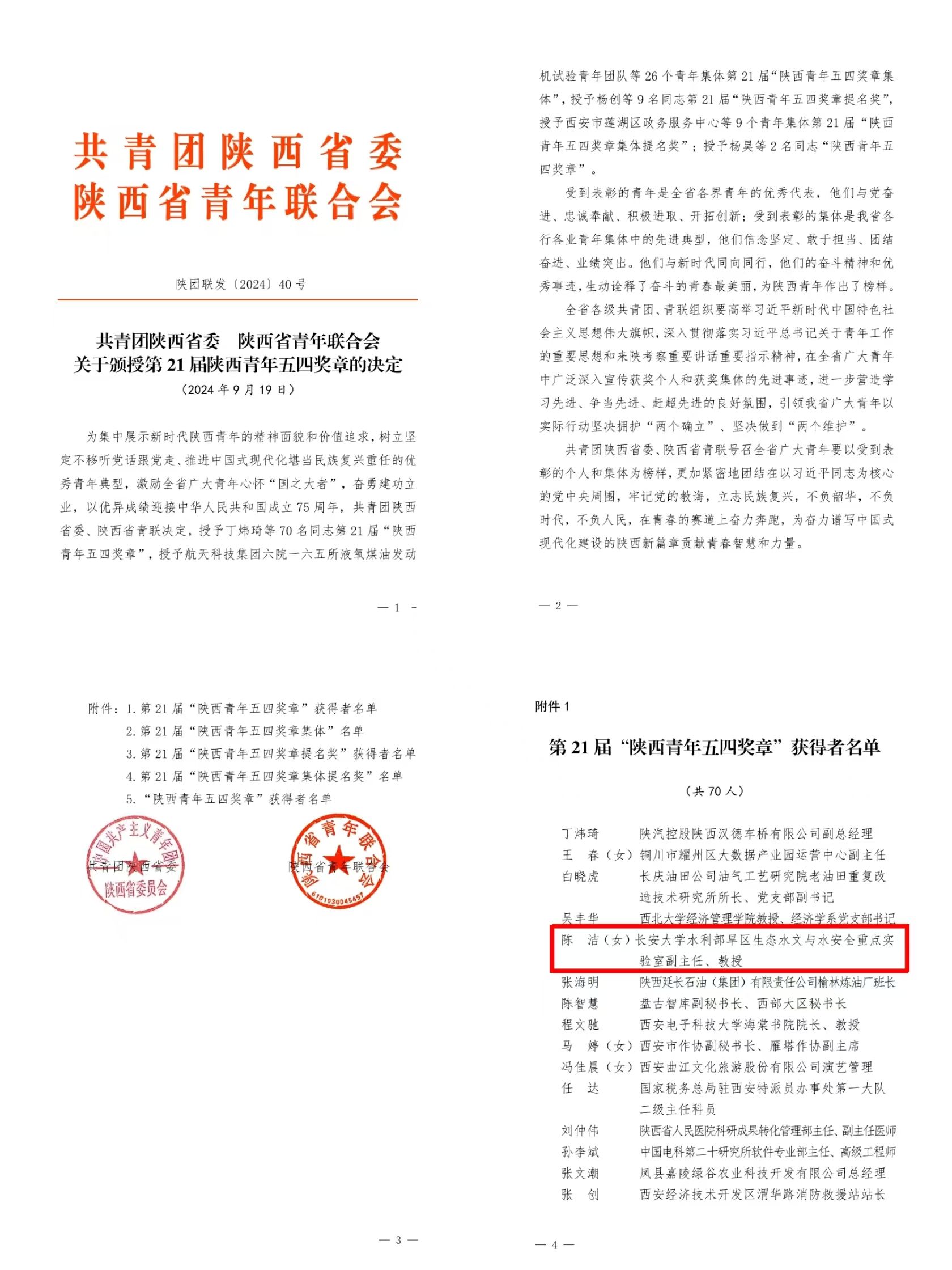 近日,《共青團陜西省委 陜西省青年聯合會關于頒授第21屆陜西青年五四獎章的決定》(陜團聯發〔2024〕40號)發布,我校水利部旱區生態水文與水安全重點實驗室副主任、水利與環境學院教授陳潔榮獲第21屆“陜西青年五四獎章”。