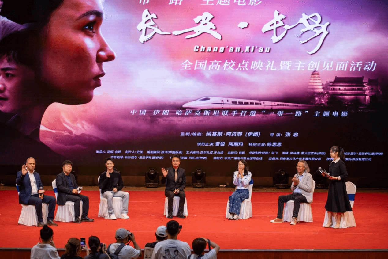 9月22日上午,電影《長安·長安》觀影會暨主創見面會活動在長安大學長安文化藝術中心大禮堂舉行。影片制片人、陜西省政協委員史佳,影片導演張忠,影片藝術顧問西爾扎提·牙合甫,伊朗制片人何飛以及影片主演曹駿、阿麗瑪蒞臨現場,校黨委副書記黎開誼在活動前會見主創人員一行,千余名師生參加活動。