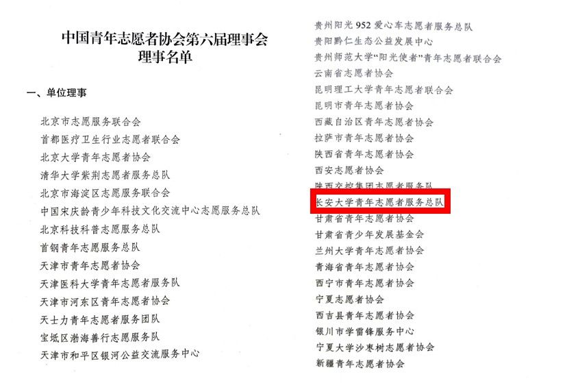 長安大學青年志愿者服務總隊(以下簡稱“總隊”)是在學校黨委領導和團委指導下的志愿公益類學生社團,自2008年成立以來,始終秉承“奉獻、友愛、互助、進步”的志愿精神,引導我校廣大青年學子踐行志愿精神,營造奉獻自我、服務社會,人人爭當志愿者的良好氛圍;在傳播社會主義核心價值觀、弘揚優秀傳統文化、鍛造青年品格上取得了良好成效。