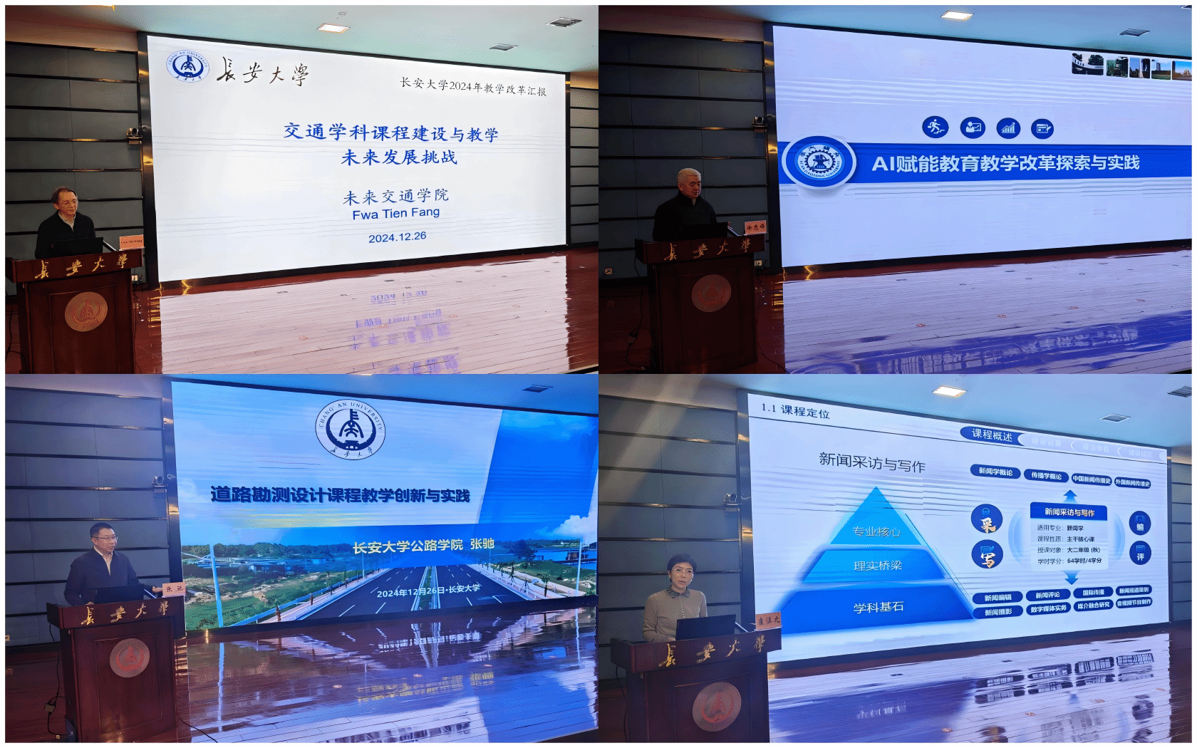 大會專題報告階段,教務處處長張圣忠作學校課程建設與改革專題工作報告,西安交通大學教師教學發展中心主任徐忠鋒教授作題為《數字化和智能化賦能課程建設》專題報告;分享交流階段,Fwa Tien Fang院士圍繞未來交通學院“課程建設與探索”進行經驗分享,公路學院張馳教授、人文學院崔慎之副教授圍繞主講課程的教學創新與實踐進行經驗交流。