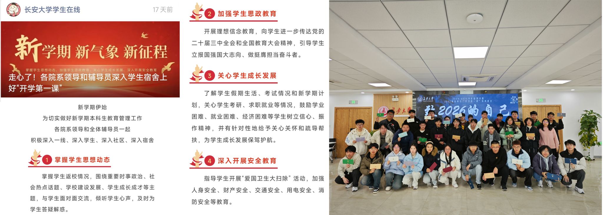 堅(jiān)持以深入調(diào)查研究為抓手,全面精準(zhǔn)掌握學(xué)生思想動(dòng)態(tài)。強(qiáng)化數(shù)字賦能,精準(zhǔn)掌握學(xué)生返校情況。依托“我在長大”學(xué)生離返校系統(tǒng)動(dòng)態(tài)掌握25345名學(xué)生離鄉(xiāng)時(shí)間、返校方式、到校時(shí)間等,通過請假系統(tǒng)跟蹤做好未按時(shí)返校學(xué)生的閉環(huán)管理。踐行“一線規(guī)則”,全面掌握學(xué)生思想動(dòng)態(tài)。圍繞重要時(shí)事政治、社會(huì)熱點(diǎn)話題、學(xué)校建設(shè)發(fā)展、學(xué)生成長成才等主題,通過發(fā)放問卷、座談訪談等方式深入開展調(diào)研,形成《長安大學(xué)本科生寒假思想動(dòng)態(tài)調(diào)研報(bào)告》1份和院(系)學(xué)生思想動(dòng)態(tài)調(diào)研報(bào)告23份。加強(qiáng)摸排疏導(dǎo),有效解決學(xué)生實(shí)際困難。摸排學(xué)生寒假期間遭受災(zāi)害事故、家庭變故等情況,及時(shí)為多名學(xué)生發(fā)放臨時(shí)困難補(bǔ)助;傾聽學(xué)生對學(xué)校建設(shè)發(fā)展的意見建議,有針對性地開展教育引導(dǎo);舉辦“寫給學(xué)期末的自己”等活動(dòng),引導(dǎo)學(xué)生制定新學(xué)期自身成長發(fā)展的目標(biāo)計(jì)劃。