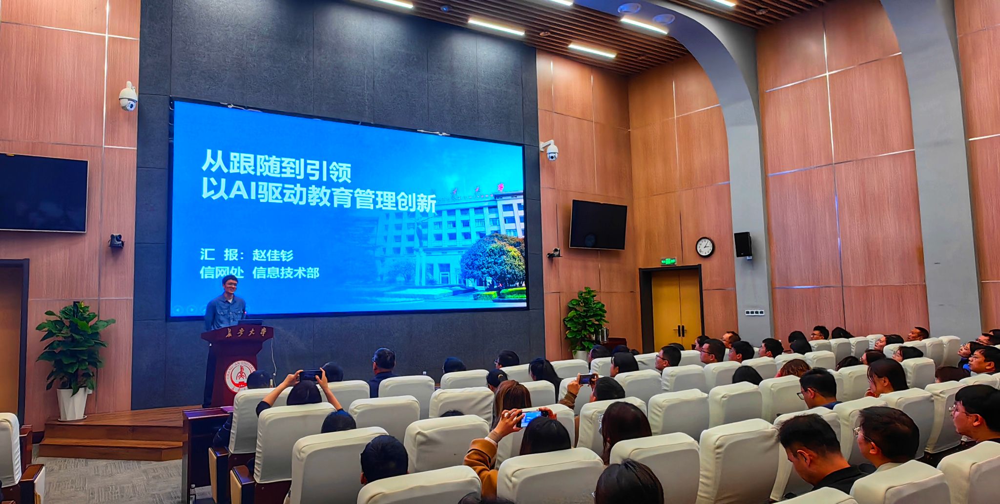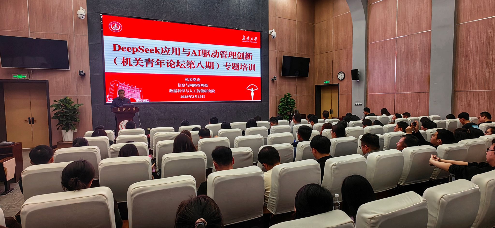 數據科學與人工智能研究院副院長李偉教授以“DeepSeek在高校場景的應用之綜合辦公篇”為主題,從DeepSeek是什么、為什么要學DeepSeek、如何快速使用DeepSeek等方面,深入講解DeepSeek融入教育教學、科研、行政辦公及多工具協作場景的應用。信息與網絡管理處信息部主任趙佳釤圍繞“從跟隨到引領,以AI驅動教育管理創新”主題,從“AI算力中臺、AI賦能辦公應用、AI賦能教育數字化轉型”等方面進行講解,重點介紹了長大AI算力中臺、智能體開發平臺建設情況,并對DeepSeek在公文撰寫、數據治理等多場景下的強大功能進行了演示。