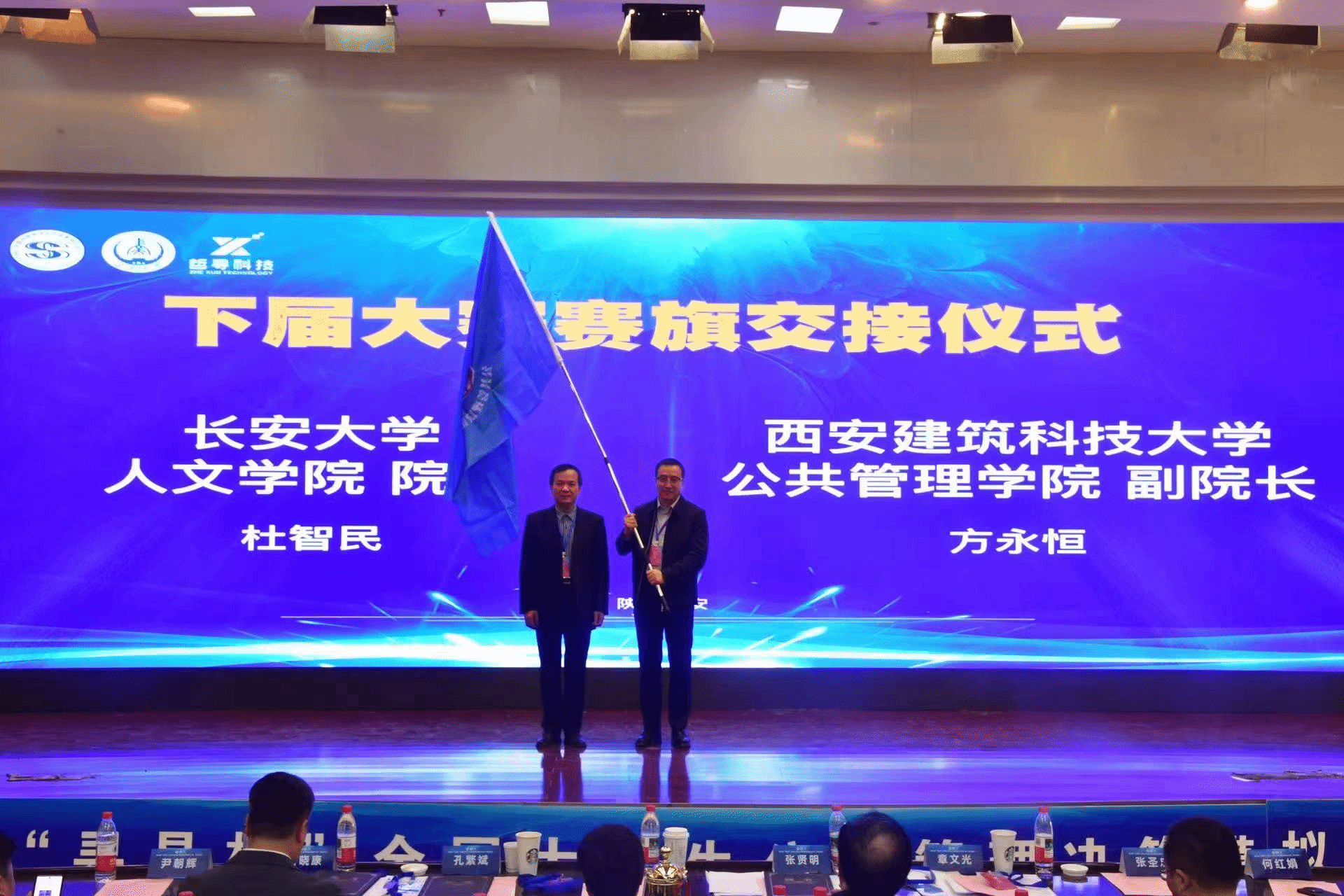 杜智民與西安建筑科技大學公共管理學院副院長方永恒分別代表本屆與下屆賽事承辦單位進行賽旗交接。