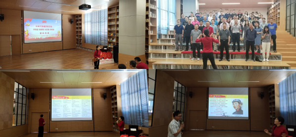 隨后在藝術階梯教室上了一堂特殊的音樂黨課。聲樂老師采用音樂、朗誦、配樂、領唱、合唱等豐富的教學形式,聲情并茂、飽含激情地講解演唱了《東方紅》、《黃河大合唱》、《南泥灣》等經典紅色歌曲,講述了歌曲背后蕩氣回腸的黨史故事和革命故事,深入淺出地闡釋了“延安精神”和紅色歌曲在中國革命歷程中的作用。一首首經典紅歌的重唱,再現了一部波瀾壯闊的中國共產黨革命史。情緒高漲時,黨員們共唱《黃河大合唱》、共憶革命年代的艱苦崢嶸歲月,用歌聲領悟延安精神、砥礪初心使命、書寫奮進決心。
