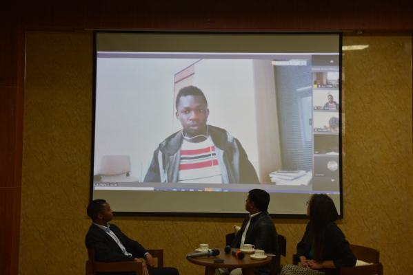 主持人馬偉就同學們感興趣的學習、專業研究以及在中國就業創業等相關問題與兩位校友進行互動。訪談還邀請了目前在同濟大學攻讀博士學位的王子與大家進行線上交流。他主要分享了學習漢語及專業課、參與科研項目的技巧和方法,并勉勵同學們腳踏實地、認真學習。