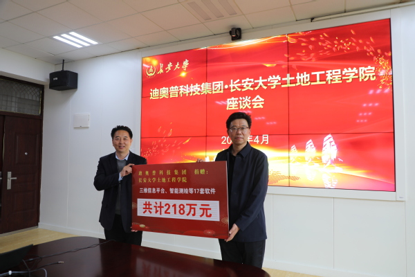 在我校70周年校慶期間,迪奧普科技集團向土地工程學(xué)院捐贈了價值218萬元的三維信息平臺、智能測繪軟件,同時召開迪奧普科技集團-長安大學(xué)土地工程學(xué)院座談會。副校長朱杰君、科技處、土地工程學(xué)院主要負責(zé)人,學(xué)院系主任參加了座談。