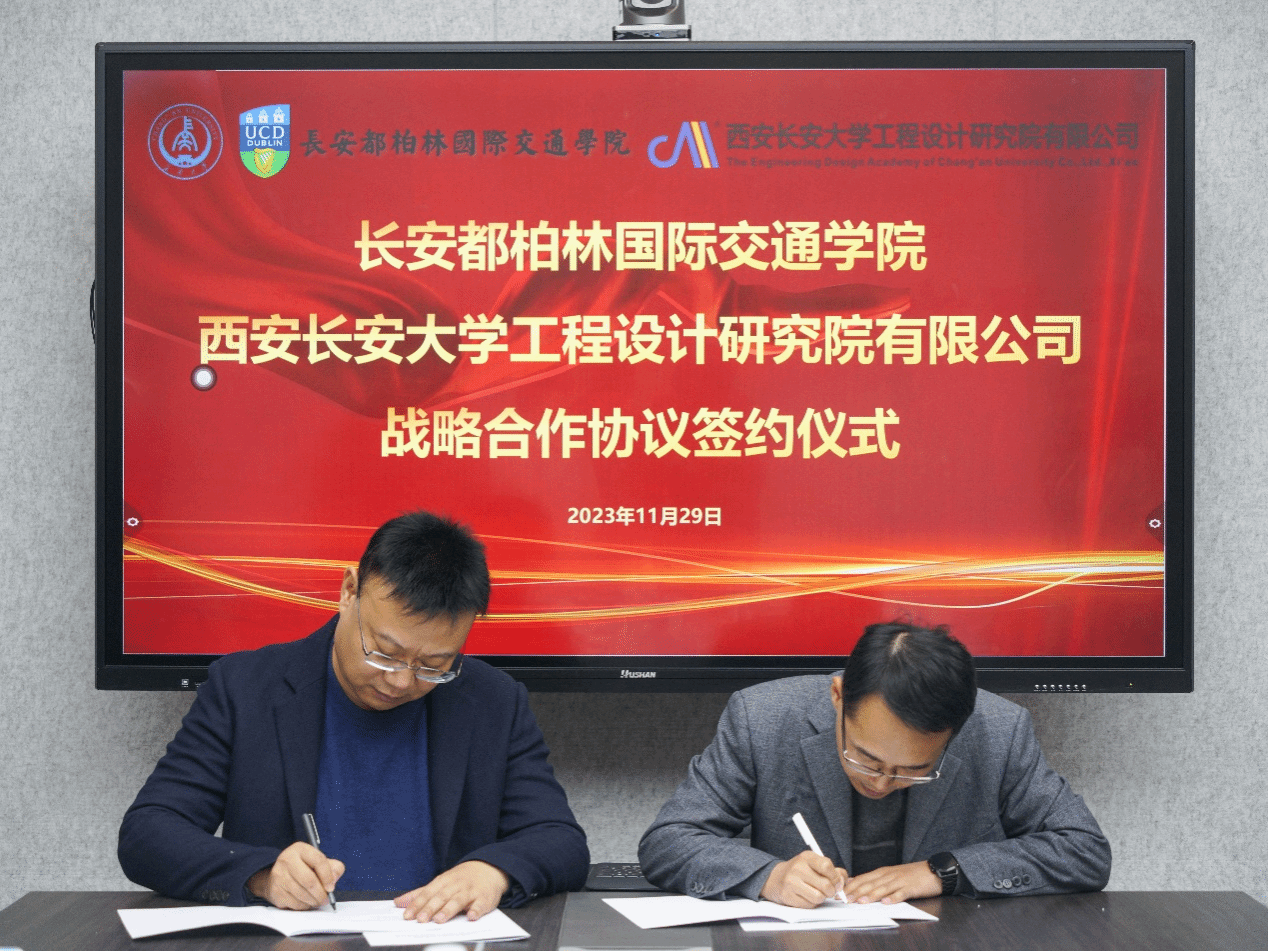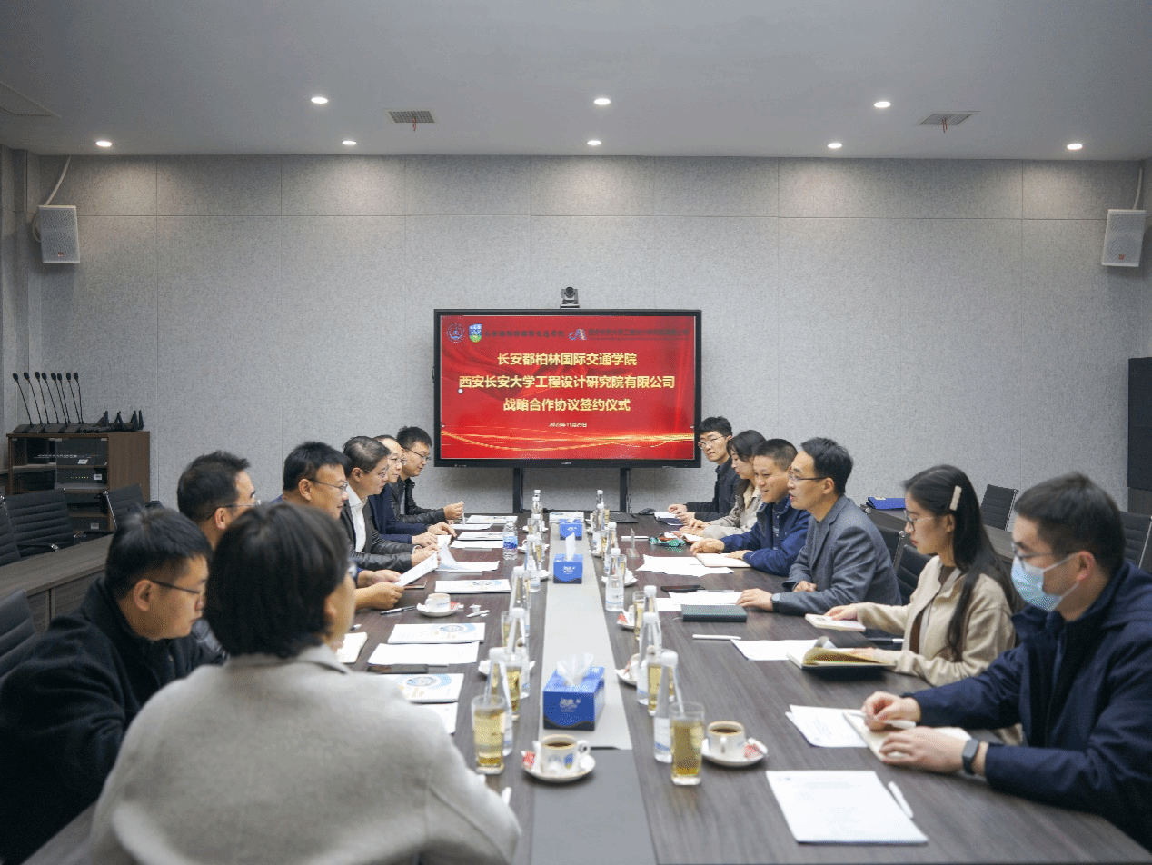 11月29日,長安都柏林國際交通學院-西安長安大學工程設計研究院有限公司戰略合作協議簽約儀式在鴻遠教學樓四樓會議室舉行,學院黨總支書記趙亮和長大設計院總經理劉紅平出席簽約儀式。長大設計院副總經理兼交通設計院院長王磊、副總經理兼市政設計院院長胡建榮、副總經理兼科技服務中心主任師暉軍,學院副院長柏強及雙方單位各部門負責人參加座談。