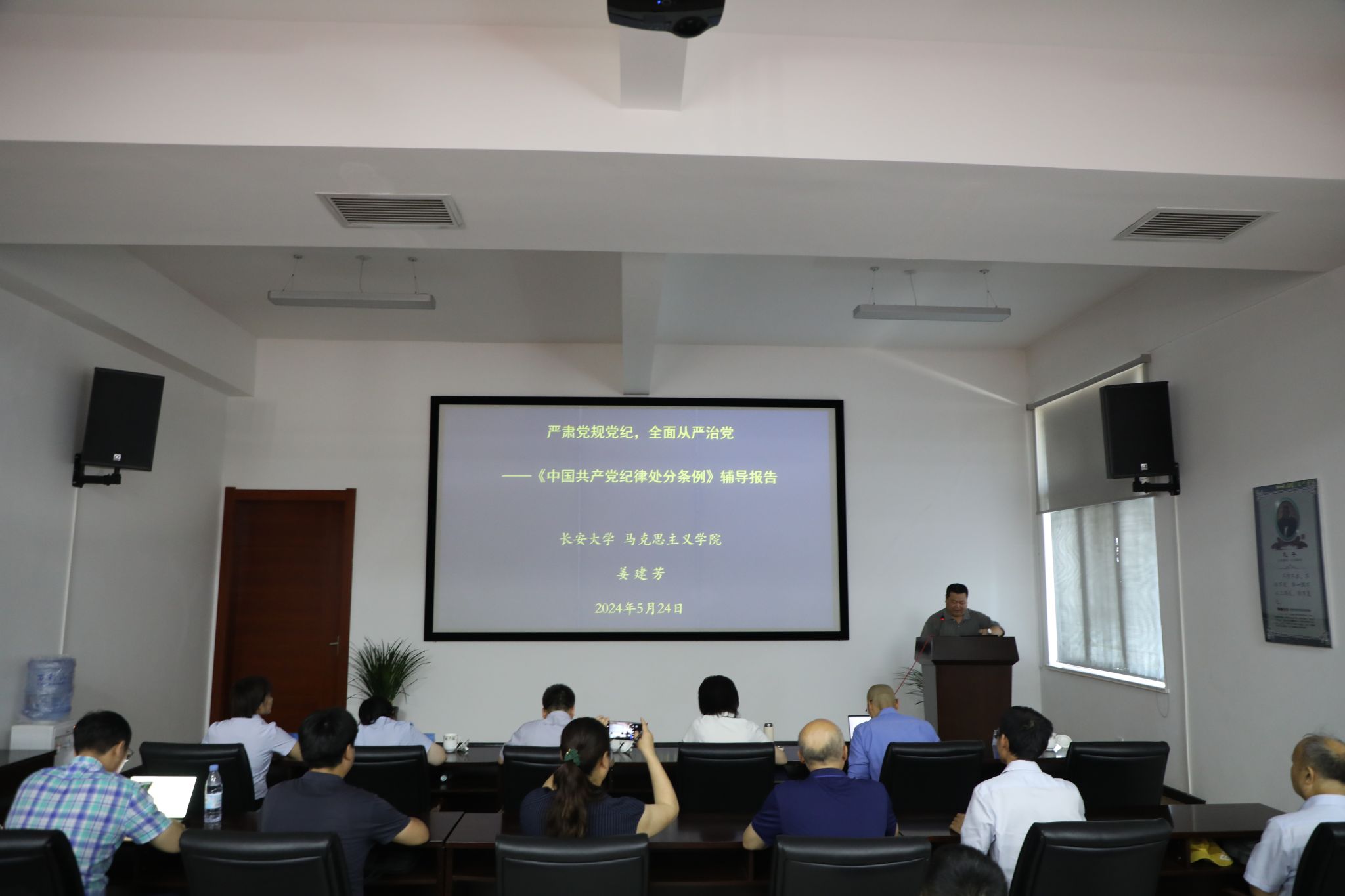 參觀結束后,雙方在地建研究院富平中試基地開展了黨紀學習教育專題黨課學習。長安大學馬克思主義學院姜建芳教授圍繞“嚴肅黨規黨紀,全面從嚴治黨”主題,結合歷史史料、典型案例,生動翔實地闡述了《中國共產黨紀律處分條例》中政治紀律、組織紀律、廉潔紀律、群眾紀律、工作紀律、生活紀律內容,強調作為黨員領導干部、科研和教育工作者,必須知敬畏、存戒懼、守底線,在工作和生活中嚴于律己、廉潔自律,做到言行一致、表里如一,真正把紀律規矩轉化為政治自覺、思想自覺、行動自覺,把嚴守紀律、砥礪作風融入日常、化為習慣,始終做到忠誠干凈擔當。在學習交流環節,李雪梅表示,紀律是黨的生命線,是增強黨的創造力、凝聚力、戰斗力的內在要求,要深刻認識到黨紀學習教育的重大意義,增強學習自覺性,始終對黨紀抱以敬畏之心,認真將黨章黨規黨紀貫穿到學習工作生活的各個方面。
