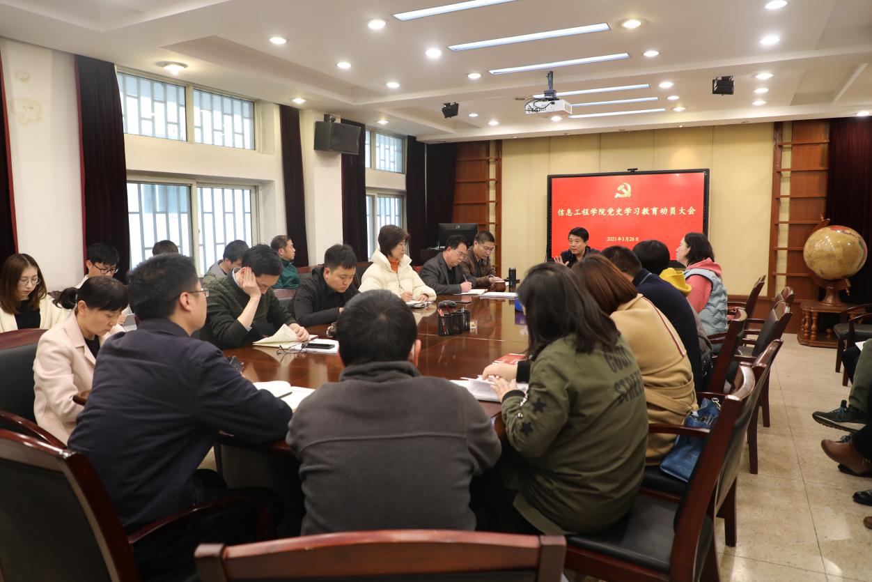 廣泛動員,認真部署,迅速推進黨史學習教育在全院開展。3月26日,學校黨史學習教育動員大會召開的次日,信息工程學院黨委召開了學院黨史學習教育動員大會。會議學習了習近平總書記在全國黨史學習教育動員大會上的重要講話精神,學院黨委書記胡予欣以《把黨史學習教育成果轉化為推動學院發展的動力》為題作動員講話。他重點圍繞“為啥學”“學什么”和“怎么學”這三個問題作了詳細安排,要求各黨支部、各單位和全院黨員要把黨史學習教育與總結經驗、推動工作結合起來,與解決學院發展中遇到的實際問題結合起來,與校黨委巡察反饋意見得整改落實結合起來,從黨的百年奮斗歷程中汲取力量,把黨史學習教育成果轉化為推動學院發展的工作動力和成效,以優異的成績為建黨百年獻禮。