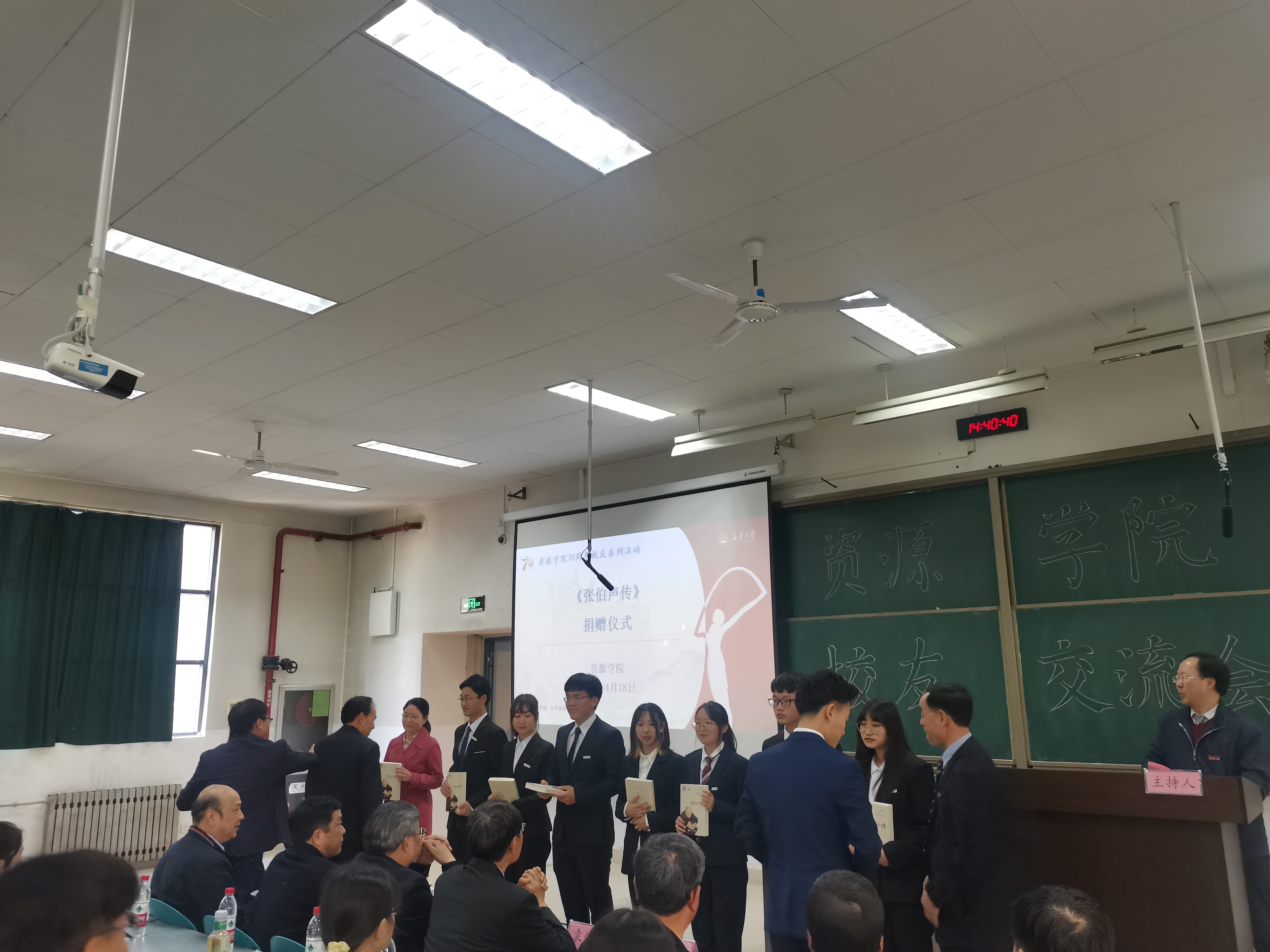 大會第二項,院長李榮西和楊興科教授向教育基金會、社會合作處和學生代表捐贈了科學出版社發行的《張伯聲傳》,號召同學們學習張伯聲潛心鉆研、科學報國精神。