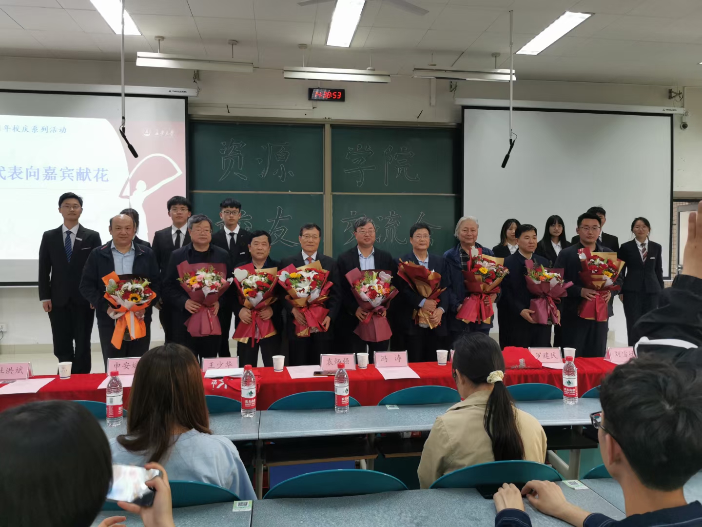 大會第一項,學生代表為嘉賓校友獻花,歡迎他們回家、參加校慶并舉行報告會。