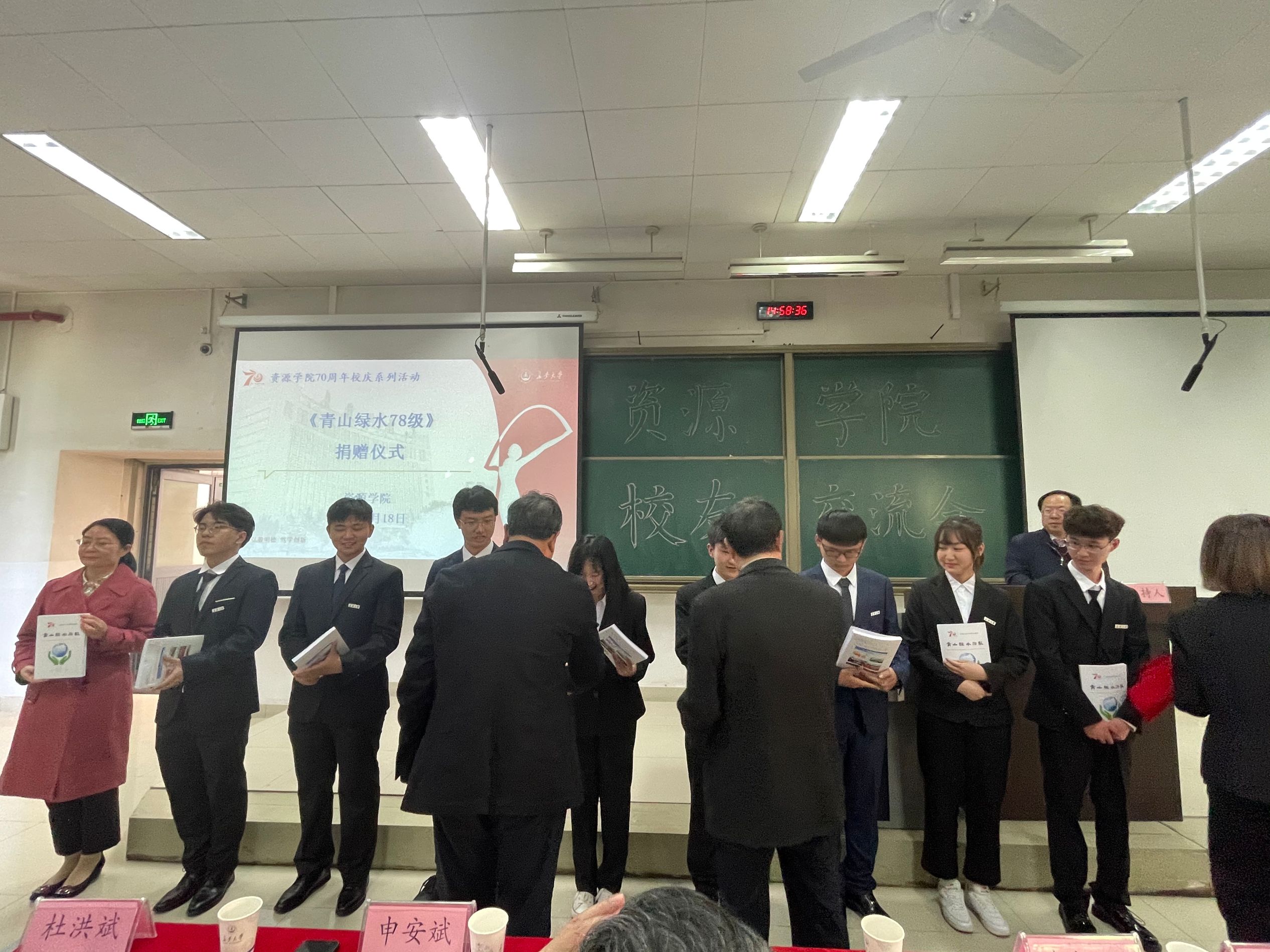 大會第三項,《青山綠水78級》紀念文集編委會主任楊興科教授介紹了文集編撰和捐贈情況;78級校友代表馮濤、袁炳強、馬寅生、羅建民向教育基金會、社會合作處和學生代表捐贈了《青山綠水78級》紀念文集。鼓勵同學們緊抓大學學習的好時光,完善自我,盡快成長成才。