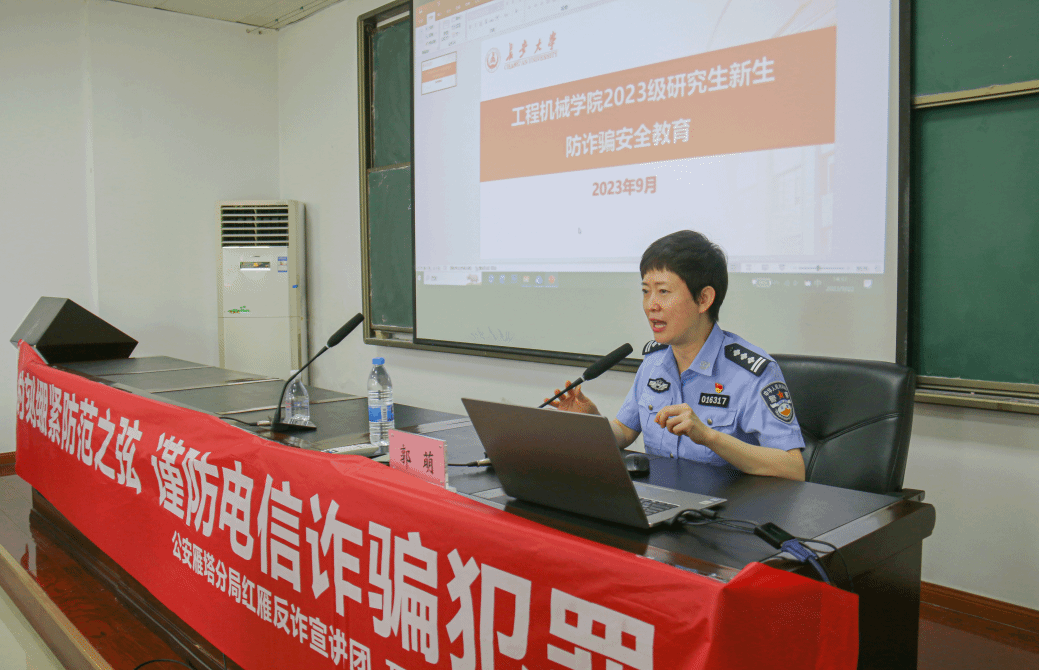 9月22日,工程機械學院邀請公安雁塔分局“紅雁”反詐宣講團二級警長郭萌在學院樓四樓報告廳舉辦“2023級研究生新生防詐騙安全教育”講座。學院2023級研究生新生參與。