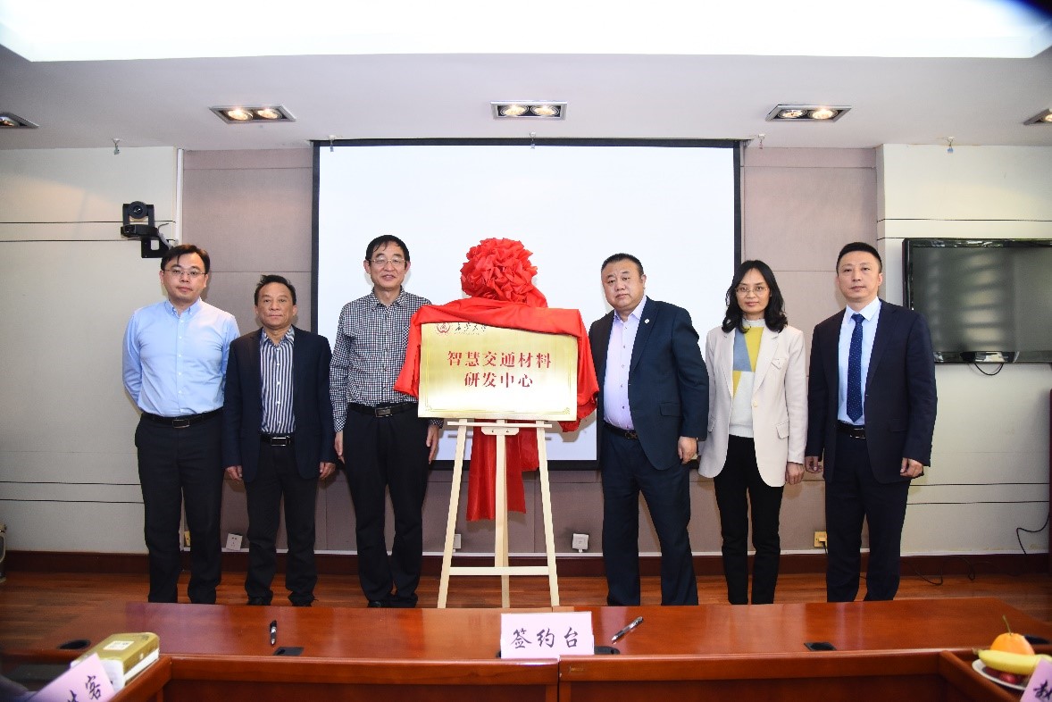 會上,材料學(xué)院與寧夏公路勘察院有限責(zé)任公司、山東海韻瀝青有限公司、海南海榕交通科技有限公司簽約了戰(zhàn)略合作與科研合作協(xié)議。長安大學(xué)“智慧交通材料研發(fā)中心”正式揭牌。