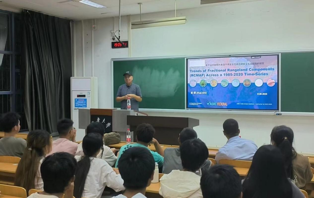 史華研究員首先從Landsat衛(wèi)星的背景信息進行了詳細介紹,并在此基礎(chǔ)上為同學(xué)們展現(xiàn)了其團隊基于Landsat影像進行的土地覆被類型制圖成果—美國牧場變化監(jiān)測評估預(yù)測系統(tǒng)(RCMAP)。隨后,他從研究背景、研究方法和結(jié)構(gòu)參數(shù)等方面具體闡述了所在課題組的數(shù)據(jù)產(chǎn)品成果RCMAP,并指出RCMAP的研發(fā)是由于牧場對氣候變化、火災(zāi)和其他人為活動具有動態(tài)響應(yīng),即牧場狀態(tài)在空間和時間上都是高度動態(tài)的,因此使用30米Landsat圖像開發(fā)了1985-2021年時間序列的RCMAP的基礎(chǔ)組件數(shù)據(jù),并不斷的對該數(shù)據(jù)產(chǎn)品進行升級。隨后,他介紹了該數(shù)據(jù)集是野外數(shù)據(jù)采集、目標檢測和回歸模型等方法制作而成,同時已經(jīng)做了幾個關(guān)鍵的改進,以更好地檢測變化,解決云和陰影覆蓋的問題,并開發(fā)了代碼來自動化這個過程。隨后,史華研究員介紹了RCMAP的主要包括4個結(jié)構(gòu)參數(shù):灌木,草本,裸地和凋落物,并且在最新版本中,又增加了樹冠冠作為一個新的參數(shù)。