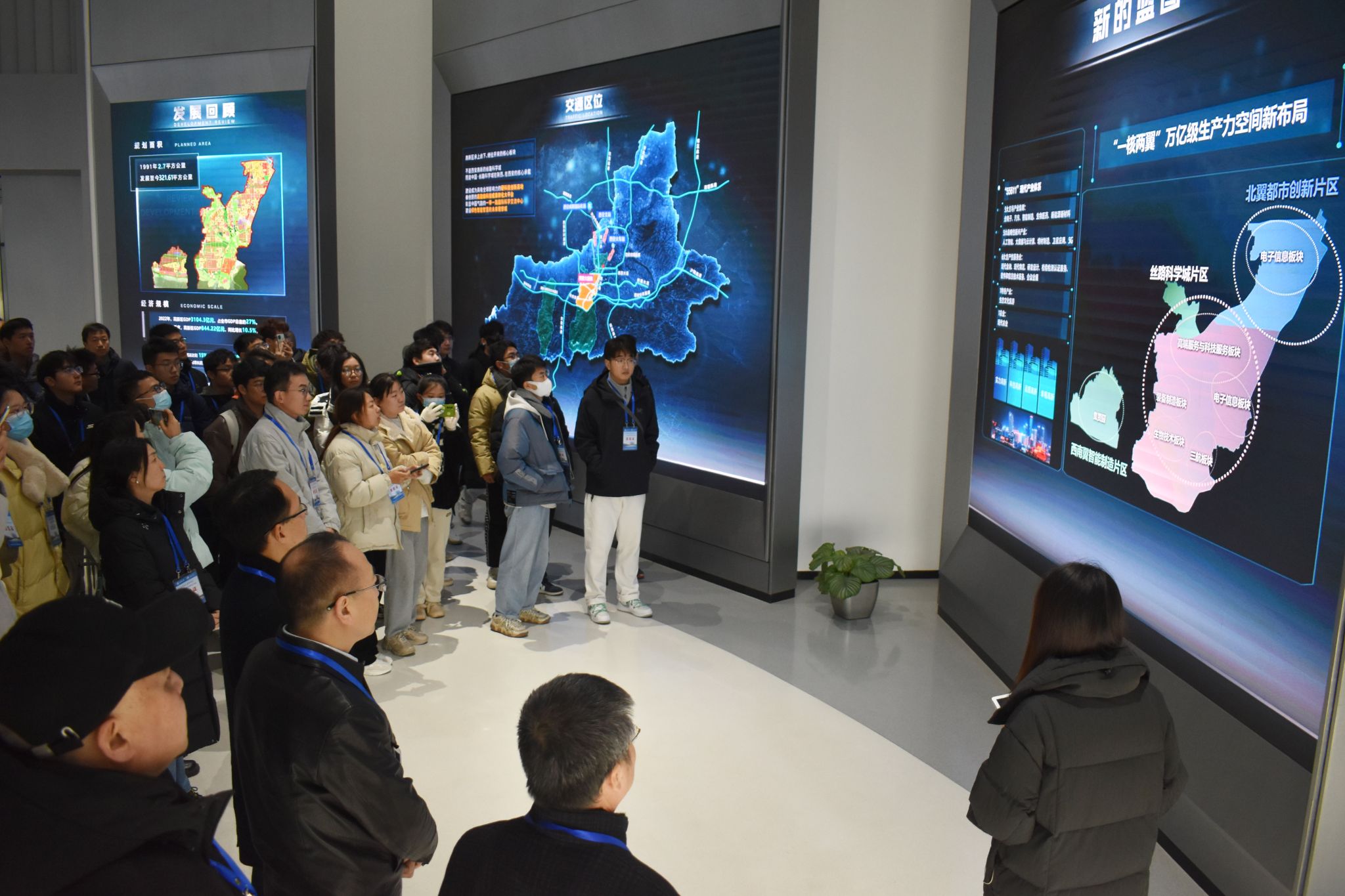 講解員向研學(xué)團(tuán)介紹西安高新區(qū)絲路科學(xué)城規(guī)劃、大劇院特殊工藝和試驗(yàn)試樣樣品