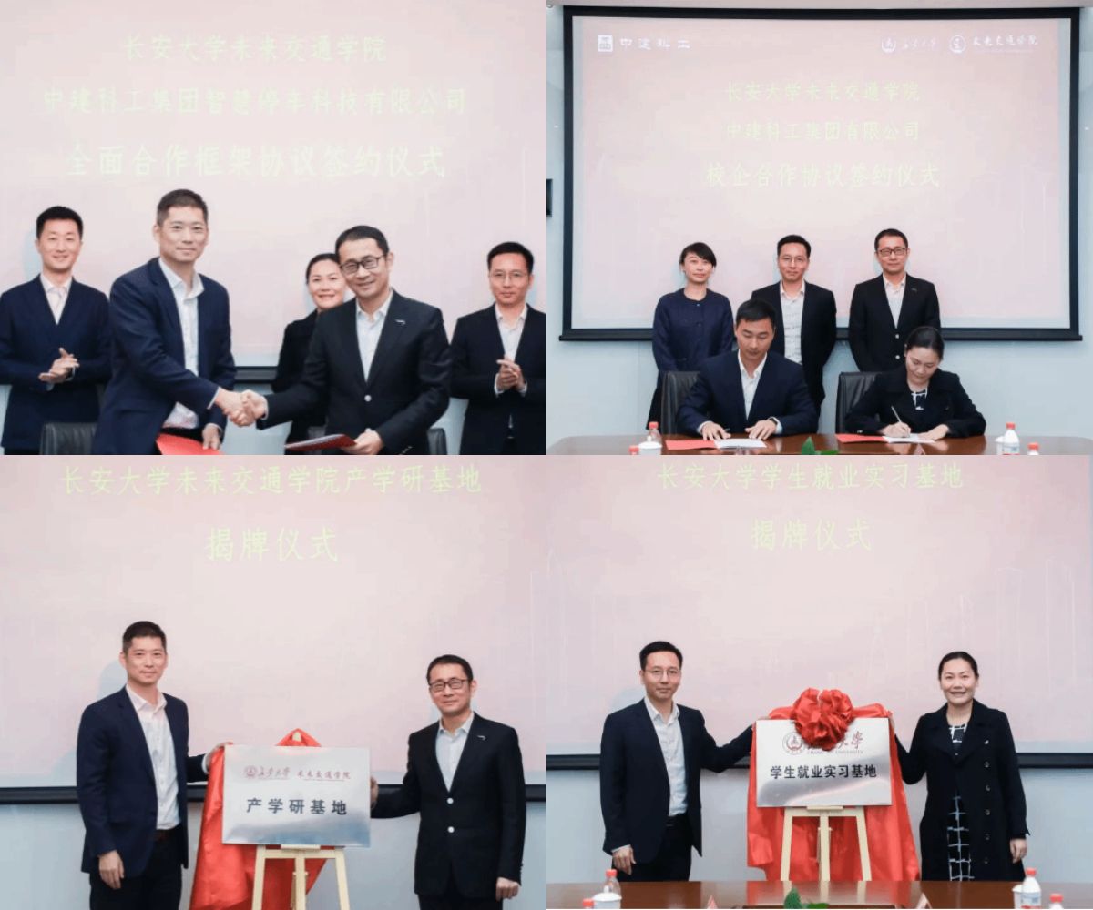 會上,學院與中建科工集團有限公司簽署校企合作協(xié)議,與中建科工智慧停車公司簽署全面合作框架協(xié)議。湯穎穎、孫銳霖為學生就業(yè)實習基地揭牌,孫健、胡帥為產(chǎn)學研基地揭牌。