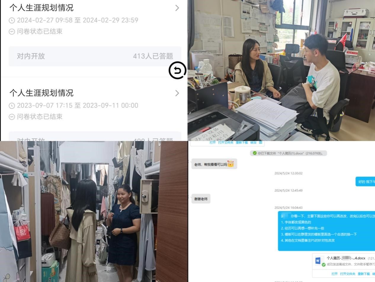 興調研之風,針對困難“點”精準幫扶。為全面了解學院2025屆本科畢業生就業意向,學院通過“我在長大”調查問卷模塊,分別于學生大三上學期和下學期開展個人生涯規劃線上調研,建立學生個人就業臺賬,為深入開展精準就業幫扶打牢基礎。落實線上線下相結合,根據調研結果,利用線下一對一談話、線上答疑解惑相結合的工作方式,開展針對性就業指導工作,與此同時,形成家校合力,引導畢業生樹立正確的成才觀、職業觀、就業觀,從實際出發選擇個人就業目標。