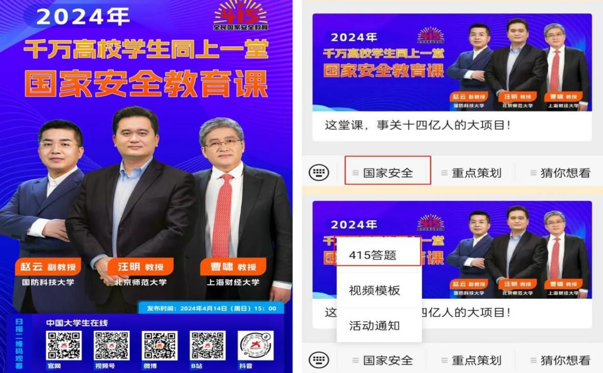 自宣教活動啟動以來,學校通過線上線下相結合的方式在校內開展國家安全宣傳教育,在校園主干道懸掛國家安全宣傳橫幅;利用校園LED電子屏播放4·15國家安全教育日宣傳視頻,滾動播放國家安全相關知識點;充分利用官網、官微及二級單位微信公眾號,全方位、多角度科普宣傳國家安全教育相關內容,做好“4·15”系列宣傳教育推送。