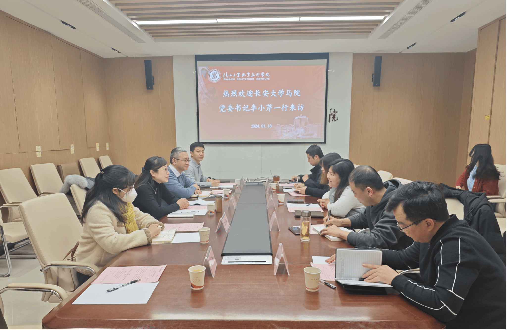 1月18日上午,馬克思主義學院黨委書記李小芹、副書記馮迪、形勢與政策教研部黨支部書記陳麗蓉、院團委書記楊帆、輔導員劉堃一行5人赴陜西工業職業技術學院馬克思主義學院走訪調研。陜西工業職業技術學院馬克思主義學院院長舒蕾、副院長王輝出席調研座談會。