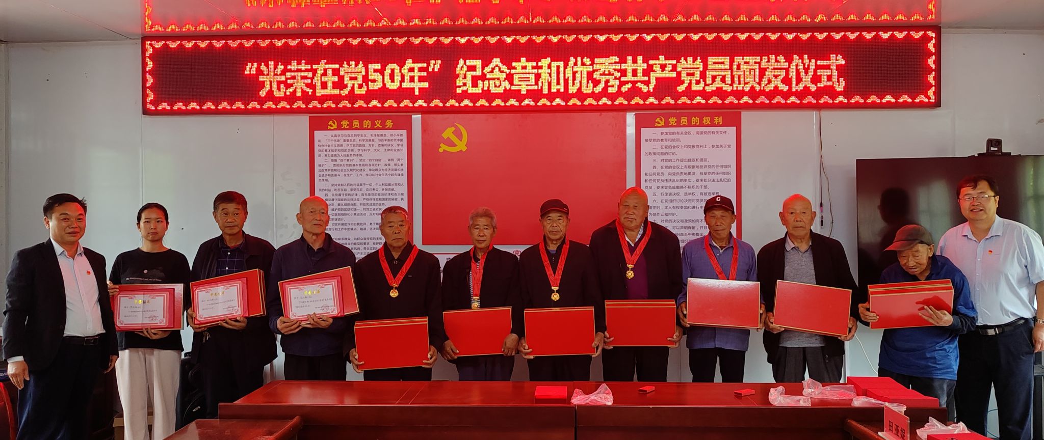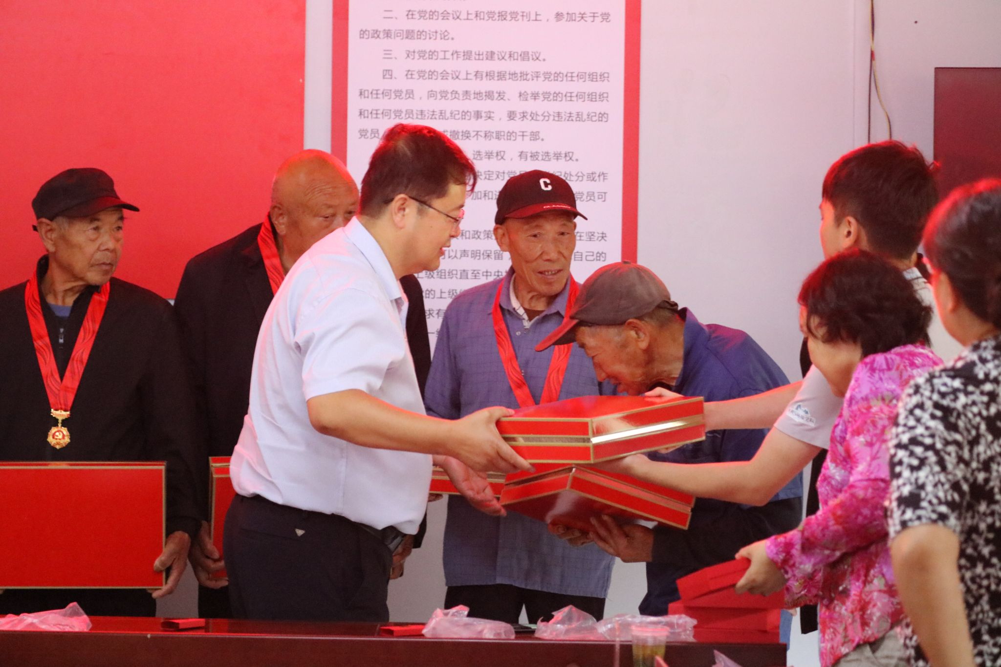 會上,舉行“光榮在黨50年”紀念章頒發儀式,張騫文和張瑞分別為村里10名榮獲獎章的老黨員逐一佩戴紀念章、發放紀念品,并向榮獲獎章的老黨員表示熱烈的祝賀和崇高的敬意。在張騫文的帶領下,全體參會黨員面對鮮紅黨旗,莊嚴宣誓,重溫入黨誓詞。