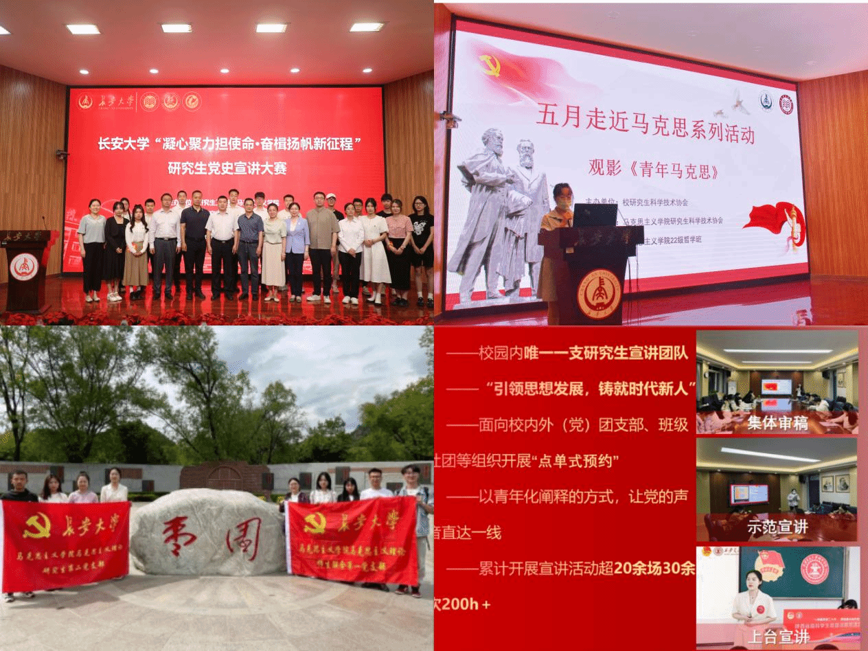 突出黨建引領,建強支部堡壘。堅持以黨建引領研究生教育培養,對標“百個研究生樣板黨支部”培育標準,打造“一支部一品牌”優秀案例4項。深入開展學習貫徹習近平新時代中國特色社會主義思想主題教育,承辦學校“凝心聚力擔使命 奮楫揚帆新征程”研究生黨史宣講大賽,激勵研究生在黨史學習教育中砥礪品格、堅定信仰;承辦學校“五月走近馬克思”系列活動,引導廣大研究生重溫馬恩經典,感悟初心使命。深入藍田、延安等革命老區、西安市警示教育基地等地開展集體研學9次,實現研究生黨性修養提升全覆蓋。創建星火宣講團研究生分部,構建本研聯動宣講格局,累計開展學生宣講活動10余場,受眾1000余人,發布宣講課單56篇。獲批校級研究生基層黨組織建設項目2項。